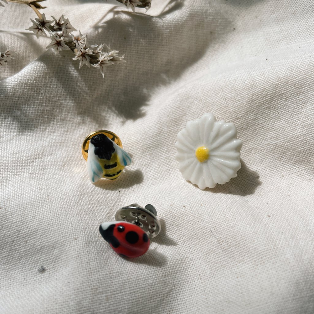 Luxusní porcelánová brož ve tvaru kopretiny. Ručně modelovaná a malovaná.