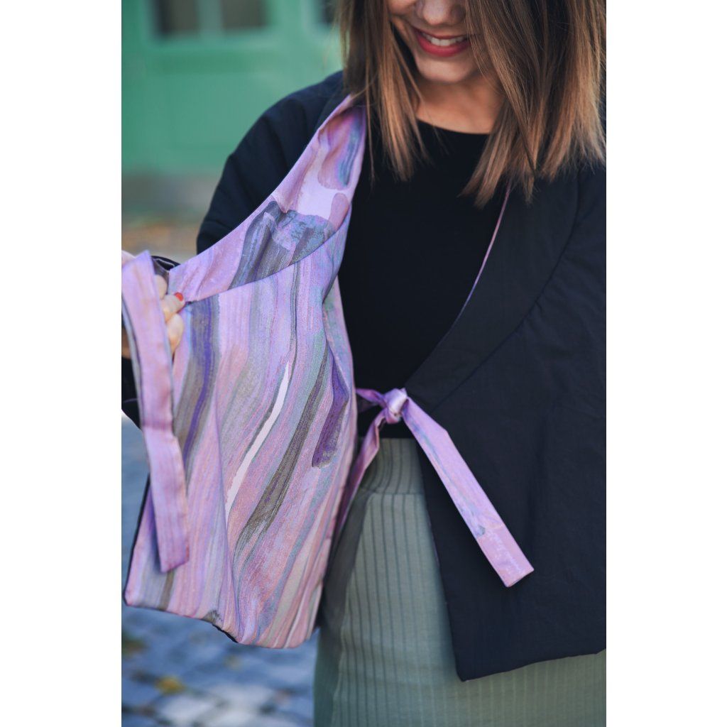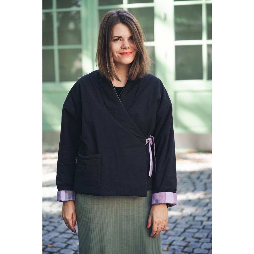 Oboustranná one size bunda z limitované autorské látky ve stylu kimona s dlouhými rukávy a zavazováním. Bunda má ze strany motivu dvě skryté kapsy a z jednobarevné strany jednu kapsu. Vypadá skvěle i nezavázaná, efektně vypadají i ohrnuté rukávy. Díky volnějšímu střihu vám v ní bude pohodlně a můžete vrstvit mikiny, svetry, podle počasí.