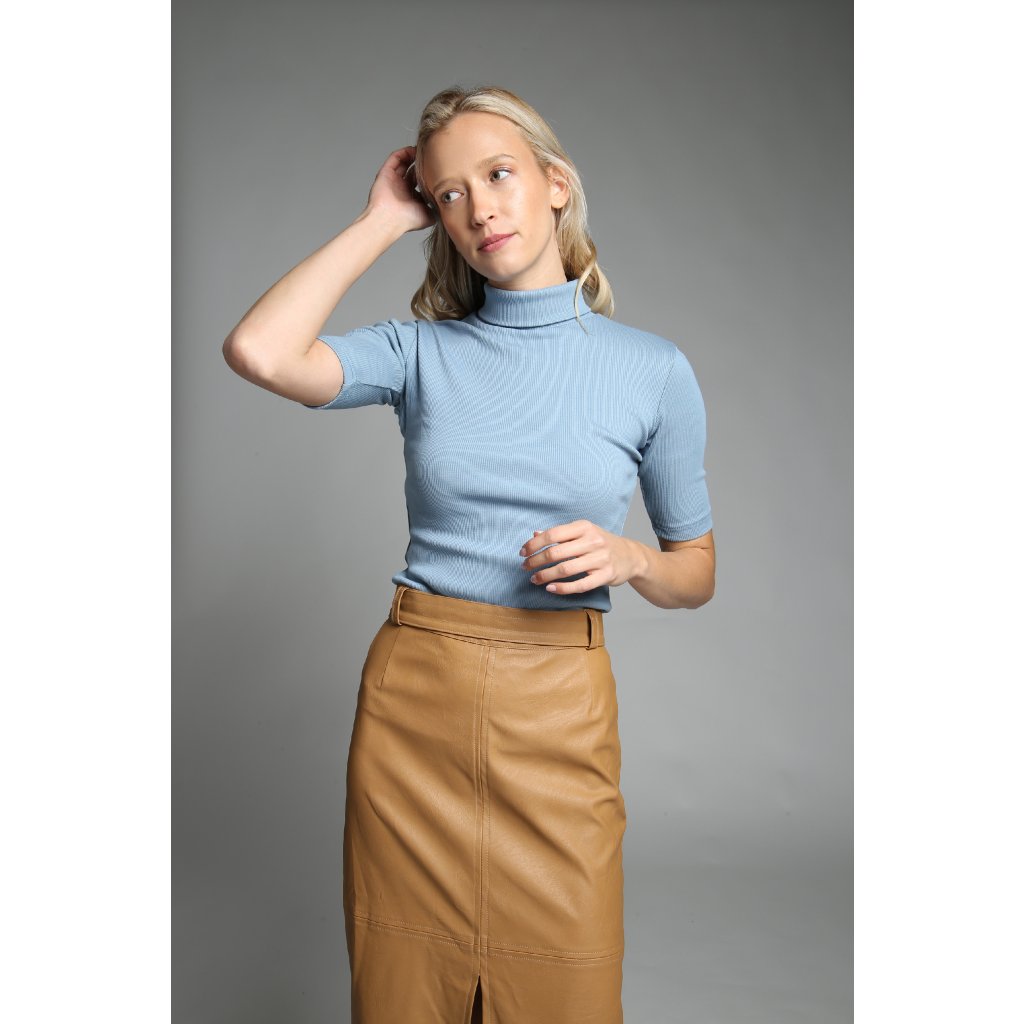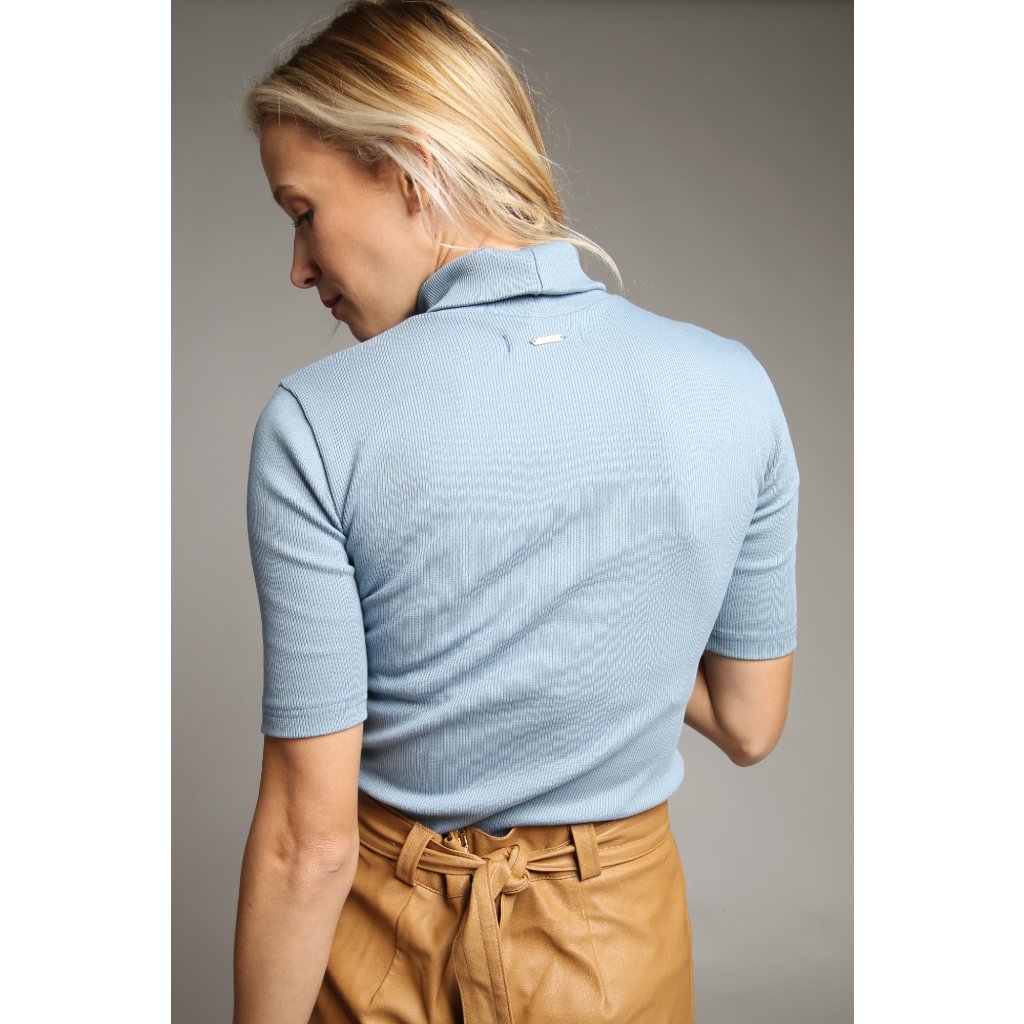 Top s rolákem je vyroben z kvalitní organické bavlny vysoké gramáže s výraznou žebrovanou strukturou. Materiál je velmi příjemný na dotek a díky malému podílu elastanu je pružný a velice pohodlně se nosí.