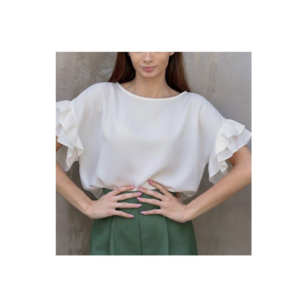 Tento top je oslavou čistého designu s jemným, ale výrazným akcentem. Jeho krátké rukávy jsou decentně řasené, čímž dodávají jinak jednoduchému střihu lehkost, ženskost a nenápadnou originalitu.