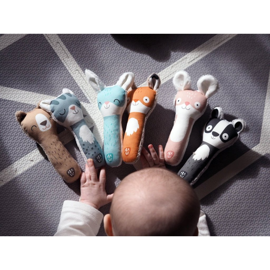 Chrastítko do nejmenších ruček. Chrastík je parťák pro miminko, který podporuje motoriku a sluch. Tvar a velikost chrastítka je ideální do malých dětských ruček. Při pokusech o první úchopy jemně chrastí. Na zadní straně má poutko s očkem, díky kterému se snadno připevní na hrazdičku nebo ke kočárku.