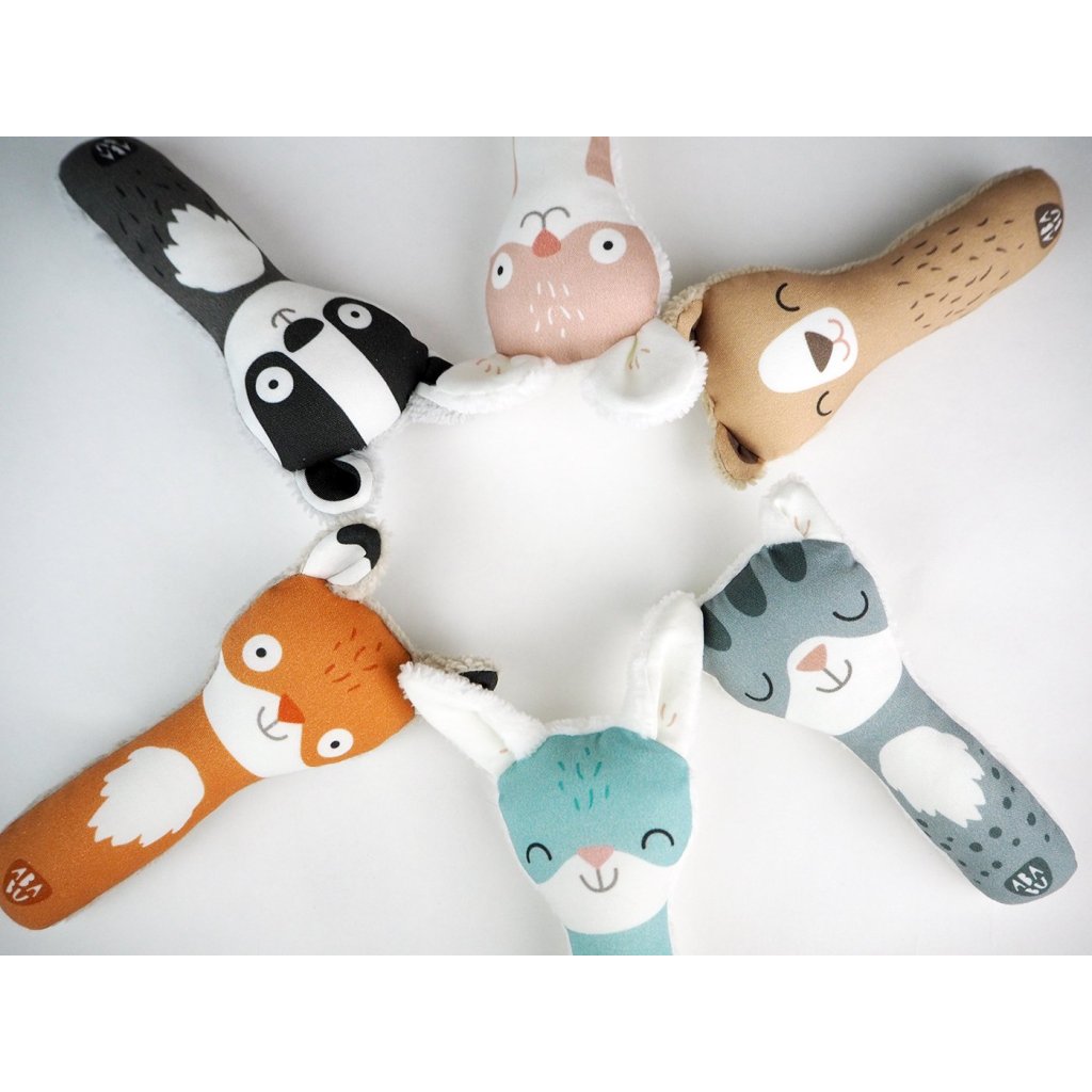 Na zadní straně má poutko, díky kterému se snadno připevní na hrazdičku nebo ke kočárku. Šňůrka je na zadní části umístěna tak, aby byla hračka vyvážená a skutečně koukala přímo na miminko. Zadní strana z bambusového heboučkého froté je super savá a odvede veškerou vlhkost při ocucávání. Bambus je přirozeně antiseptický a uschne závratnou rychlostí.