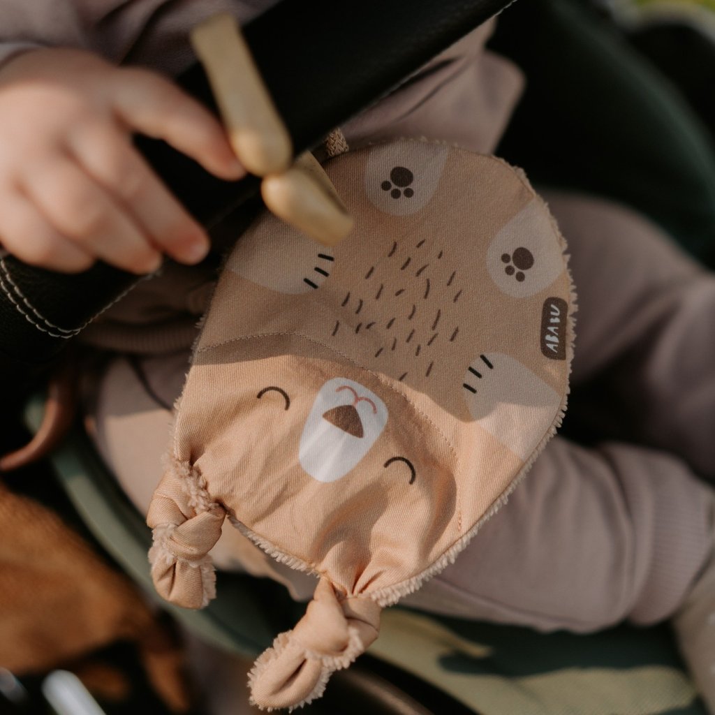 Tvar a velikost jsou ideální pro malé dětské ručičky. Při pokusech o první úchopy jemně praská. Zamotané uši můžete podle chuti rozvázat, ale jeho uzlíky se budou báječně ocucávat. Zadní strana z bambusového heboučkého froté je super savá a odvede veškerou vlhkost při ocucávání. Bambus je přirozeně antiseptický a uschne závratnou rychlostí.