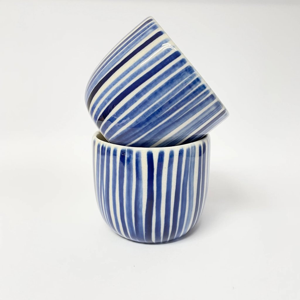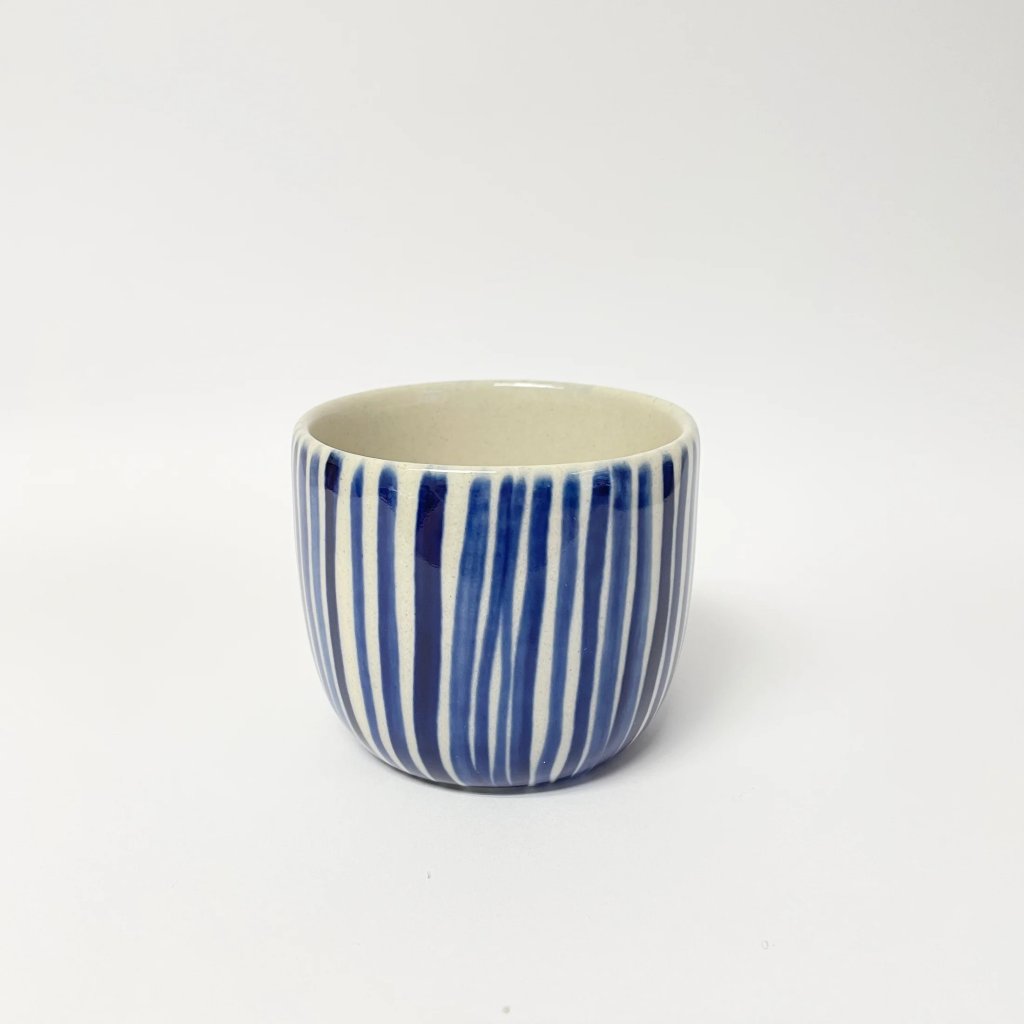 Kalíšek ze světlé kameniny s modrým dekorem a transparentní lesklou glazurou.