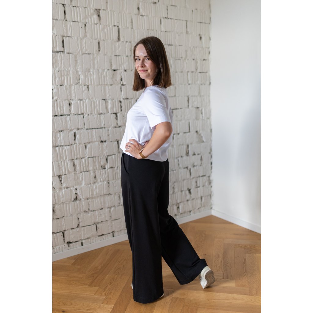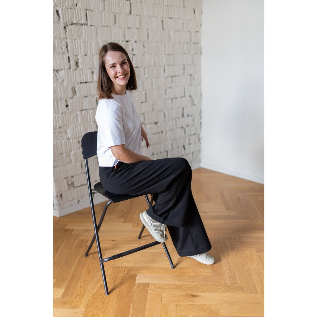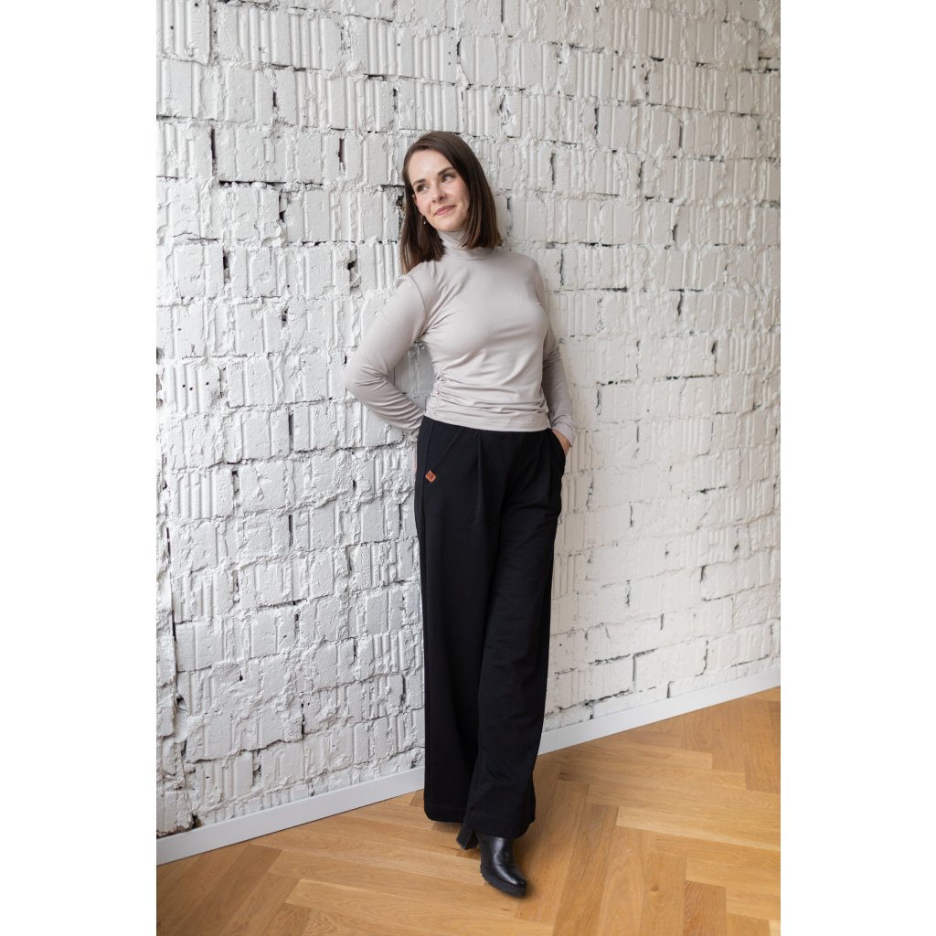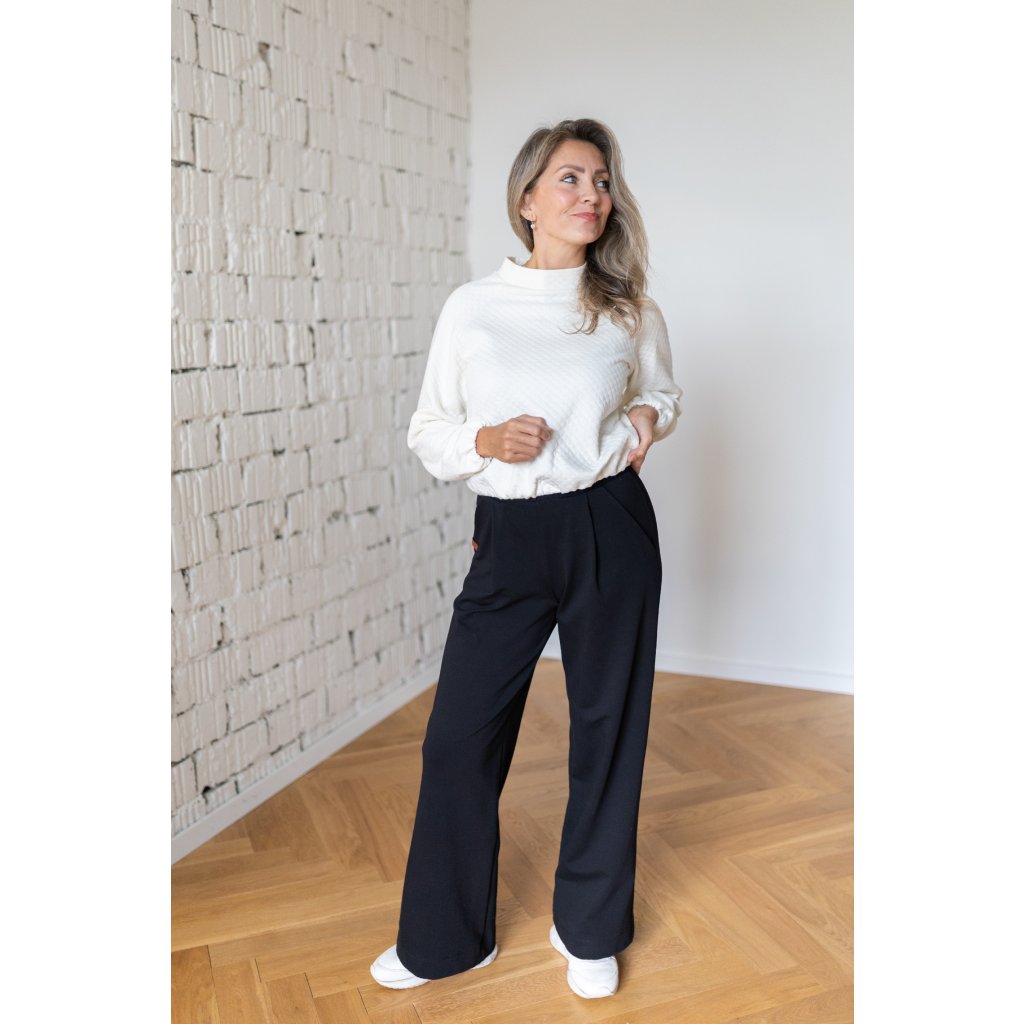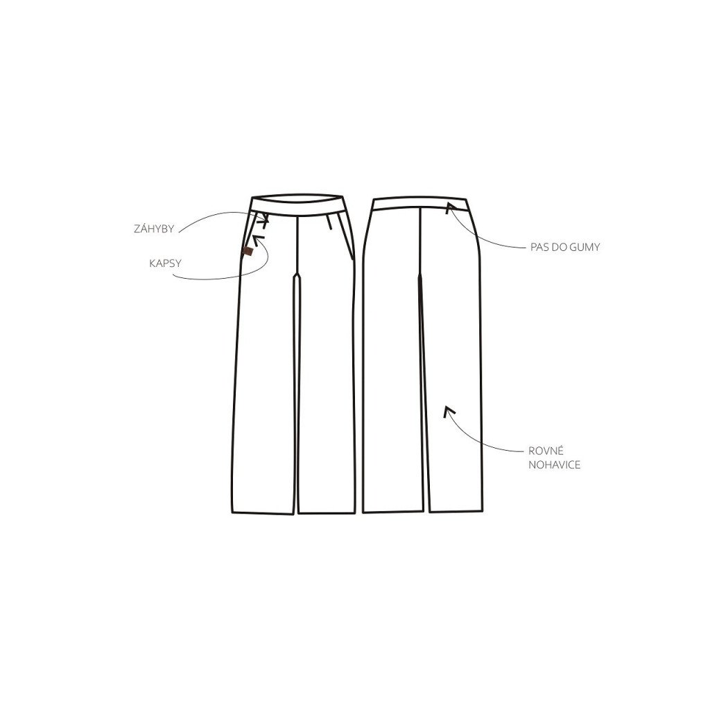 Kalhoty jsou navrženy tak, aby podtrhly ženskou siluetu a zároveň poskytovaly maximální pohodlí. V pase jsou pružné, opatřené gumou, která netlačí a přizpůsobí se každému pohybu. Výrazné záhyby přidávají na eleganci, zatímco volnější střih a větší objem zajišťují vzdušnost a svobodu pohybu. Oproti původnímu modelu jsme zvětšily objem kalhot o 8 cm a uvolnily gumu v pase o 4 cm, což činí tento model ideálním i pro ženy, které preferují volnější střih.