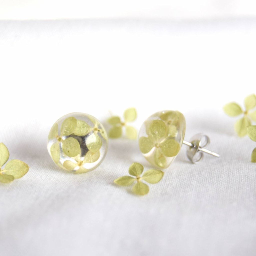 Náušnice s květinou zalité v křišťálové pryskyřici ve trvaru srdce.