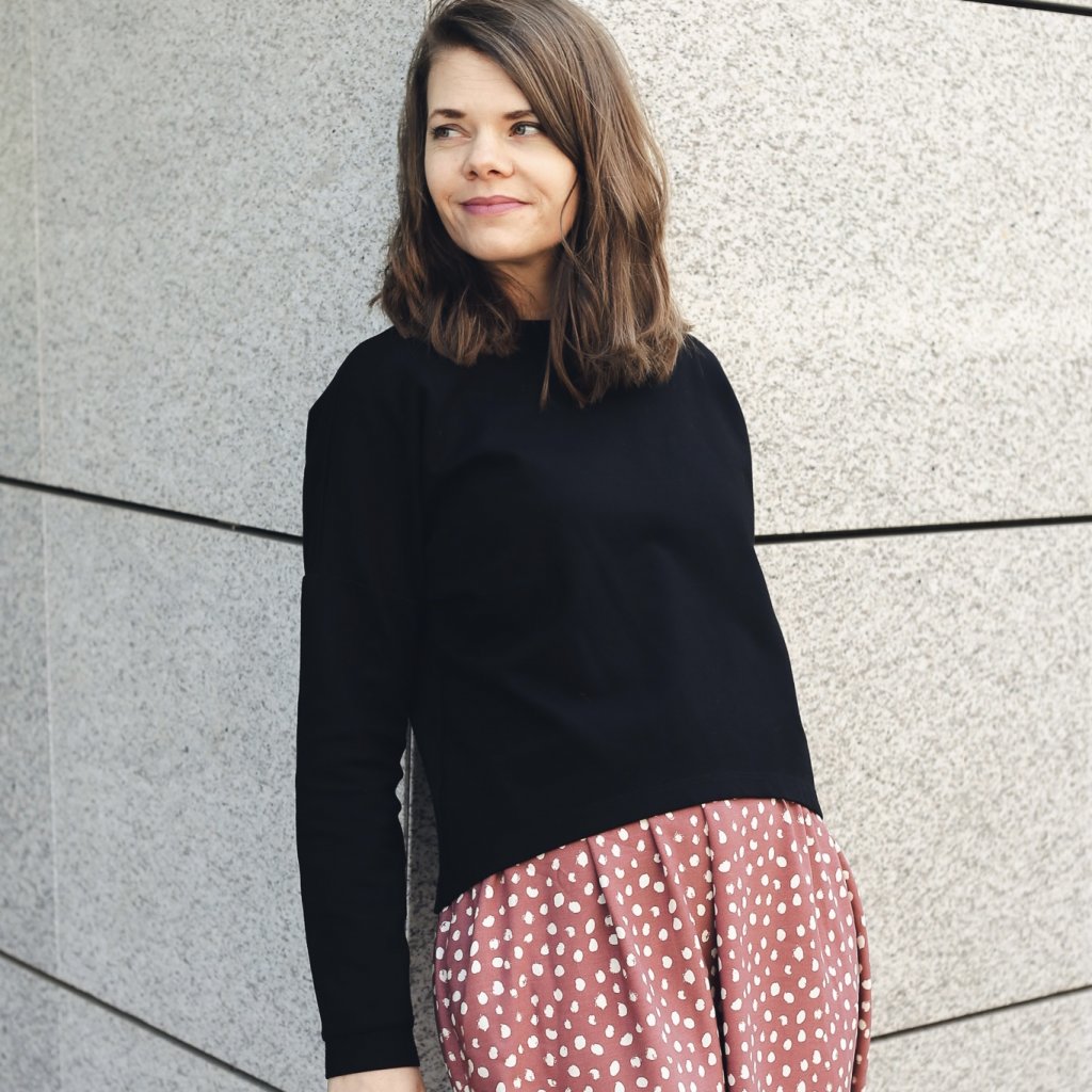 Elegantní mikina z krásného materiálu Punta di Roma, která se běžně používá na společenské oděvy. Mikina nemá kapsy, ale je určena hlavně pro vrstvení k šatům a pasovým sukním a vypadá skvěle i ke kalhotům. Punta di Roma má krásnou zářivou barvu, je vyšší gramáže, nemačká se, je hladká a moc příjemná na těle. Látka je vyrobena ze směsi viskózy, polyamidu a elastanu a i když se nezdá, v chladných dnech v ní není zima a její výhodou je, že se opravdu málo mačká. Látka má certifikát o zdravotní nezávadnosti OEKO-TEX CLASS 1, takže je ideální i pro citlivou pleť a pro alergiky. Po vyprání mikinu vyvěste a nebudete ji muset moc žehlit.