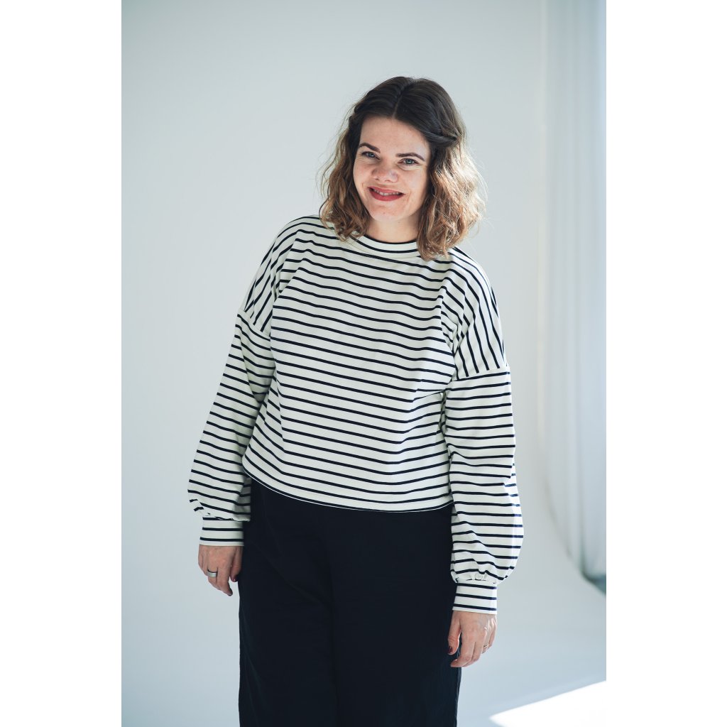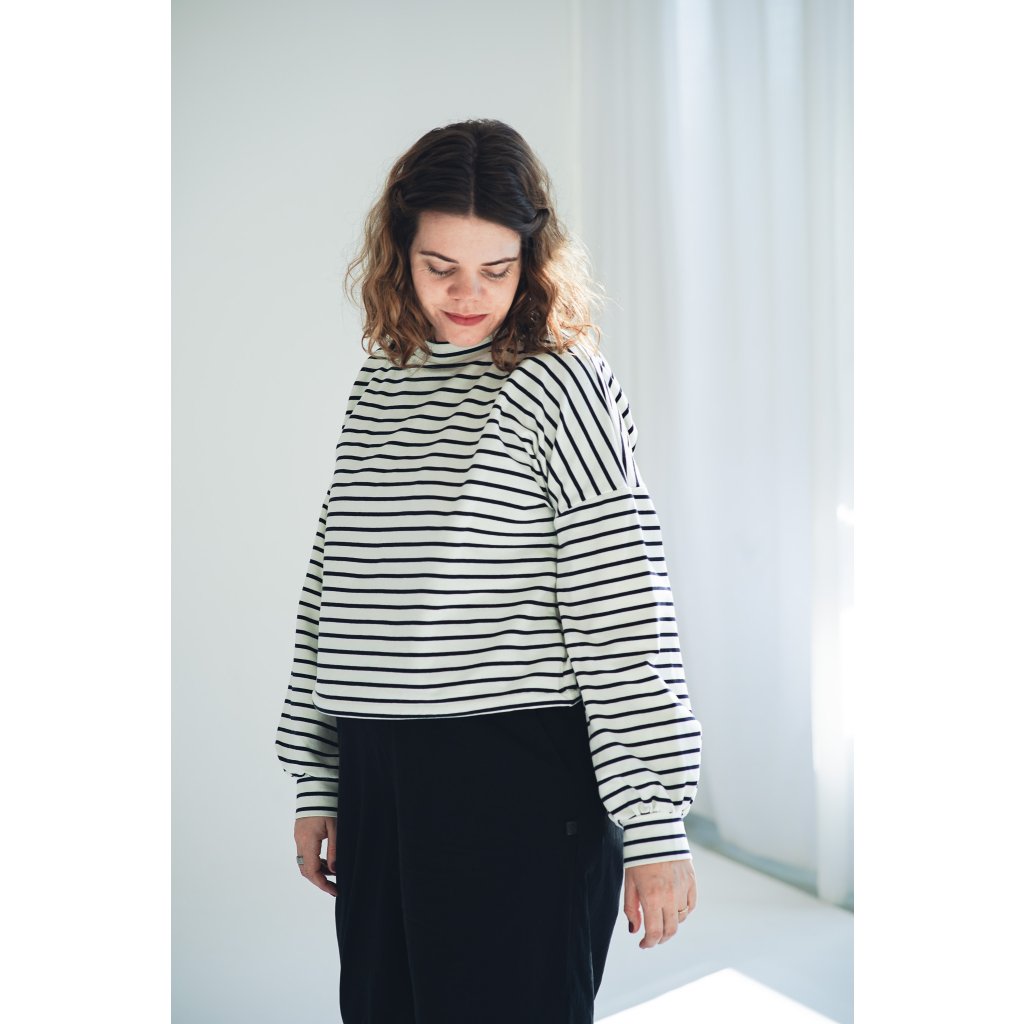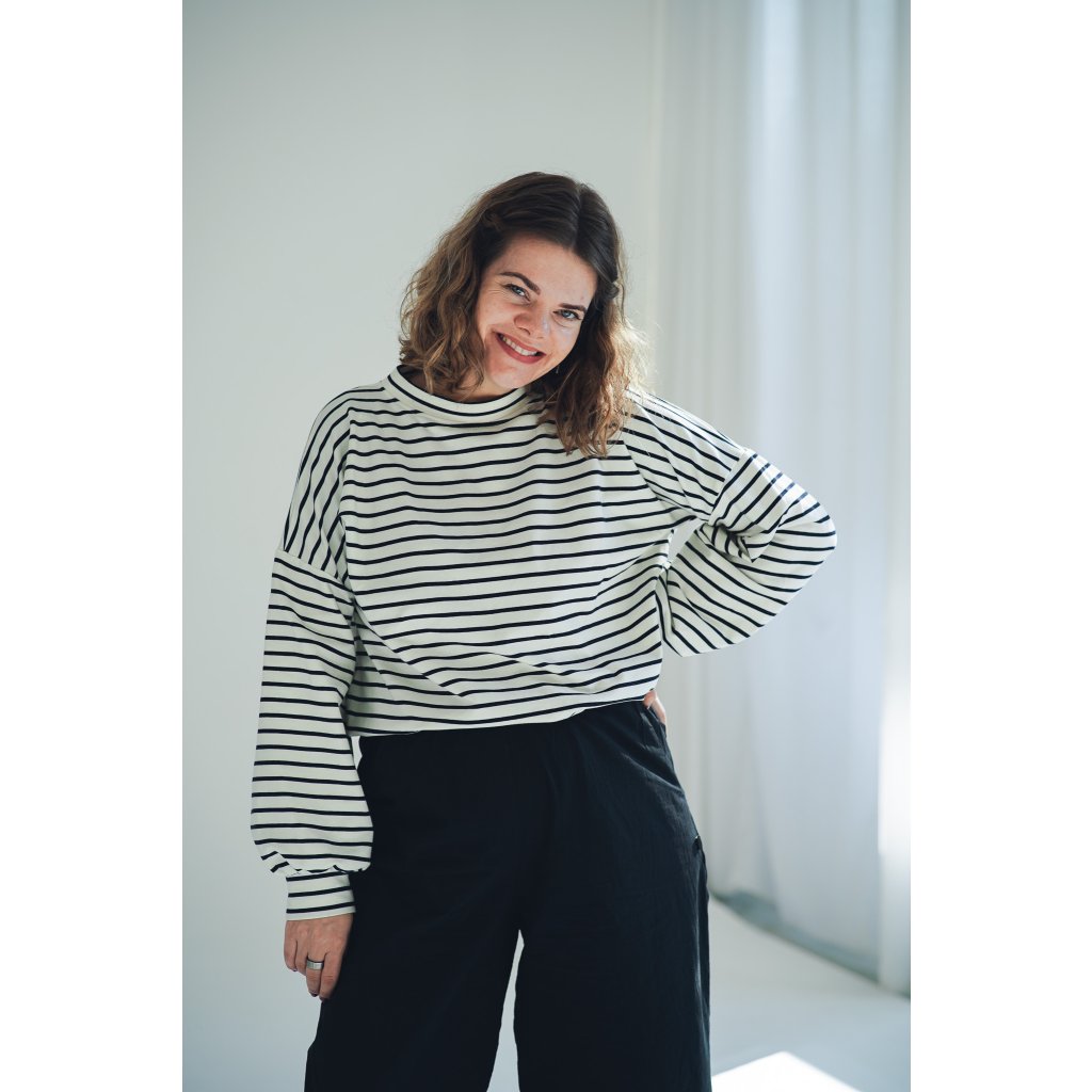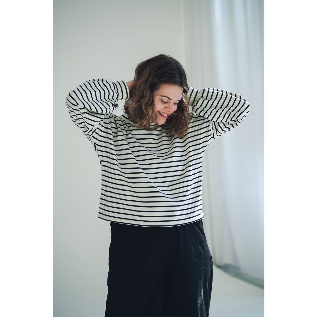 Mikina Fluff ve střihu crop-top s lehce nařasenými rukávy. Mikina má stahování na gumičku, takže ji můžete stáhnout a nařasit nebo nosit volně, rovnou. Skvěle se kombinuje s našimi vestami, ale sluší jí to i s šaty a sukněmi. Naším cílem bylo vytvořit univerzální mikinu, která se dá nosit v různých variantách a bude to základ do vašeho minimalistického šatníku.