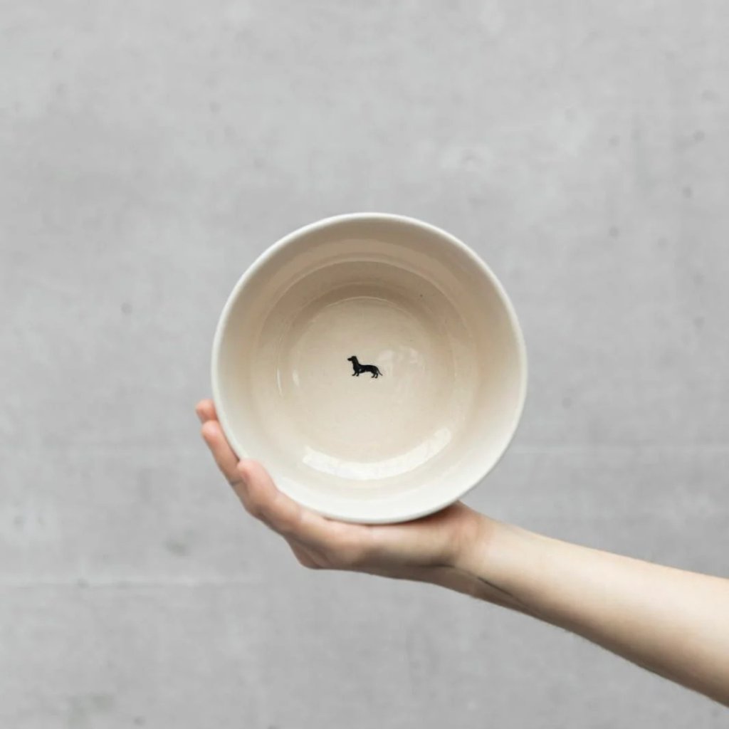 Miska ze světlé kameniny s detailem jezevčíka a transparentní lesklou glazurou.