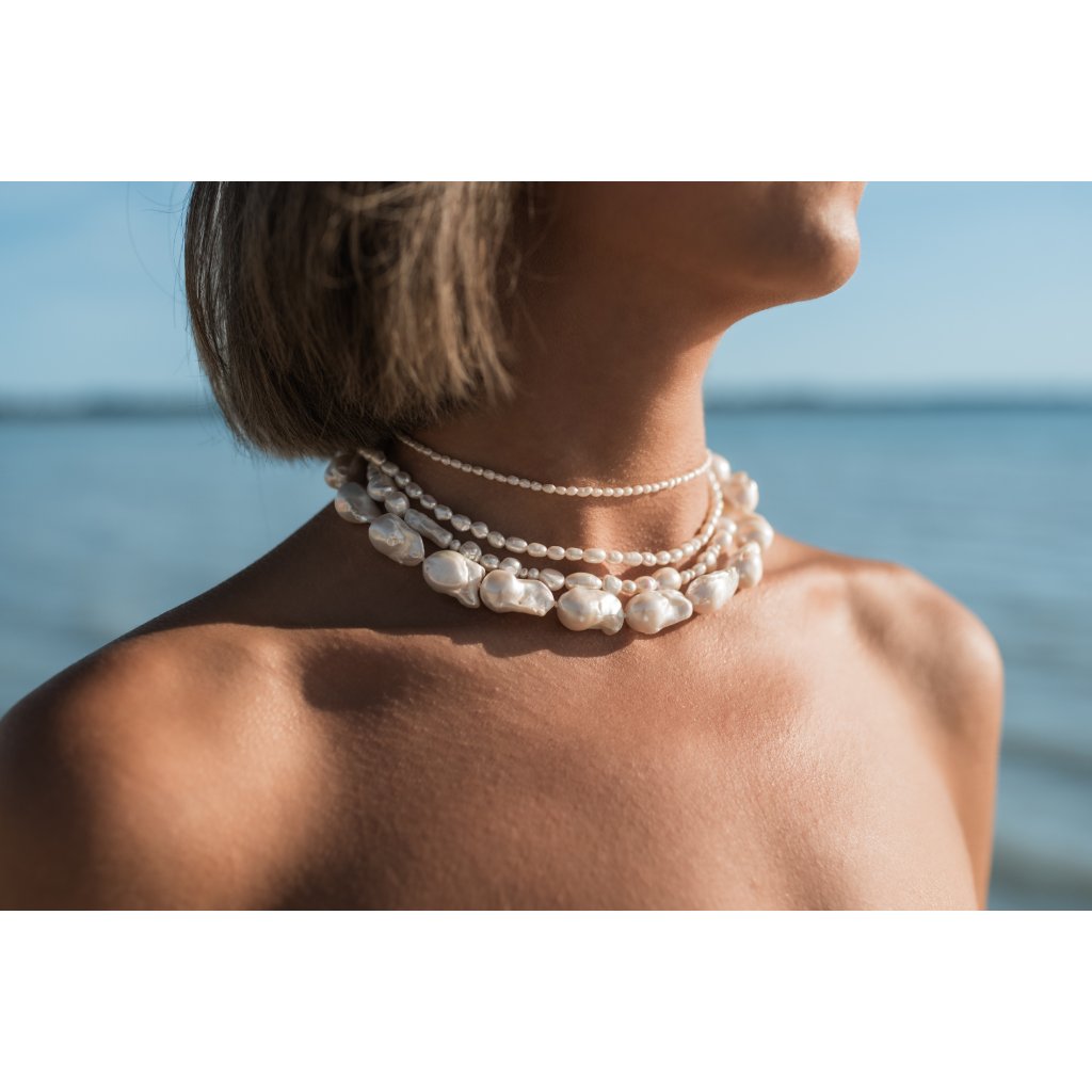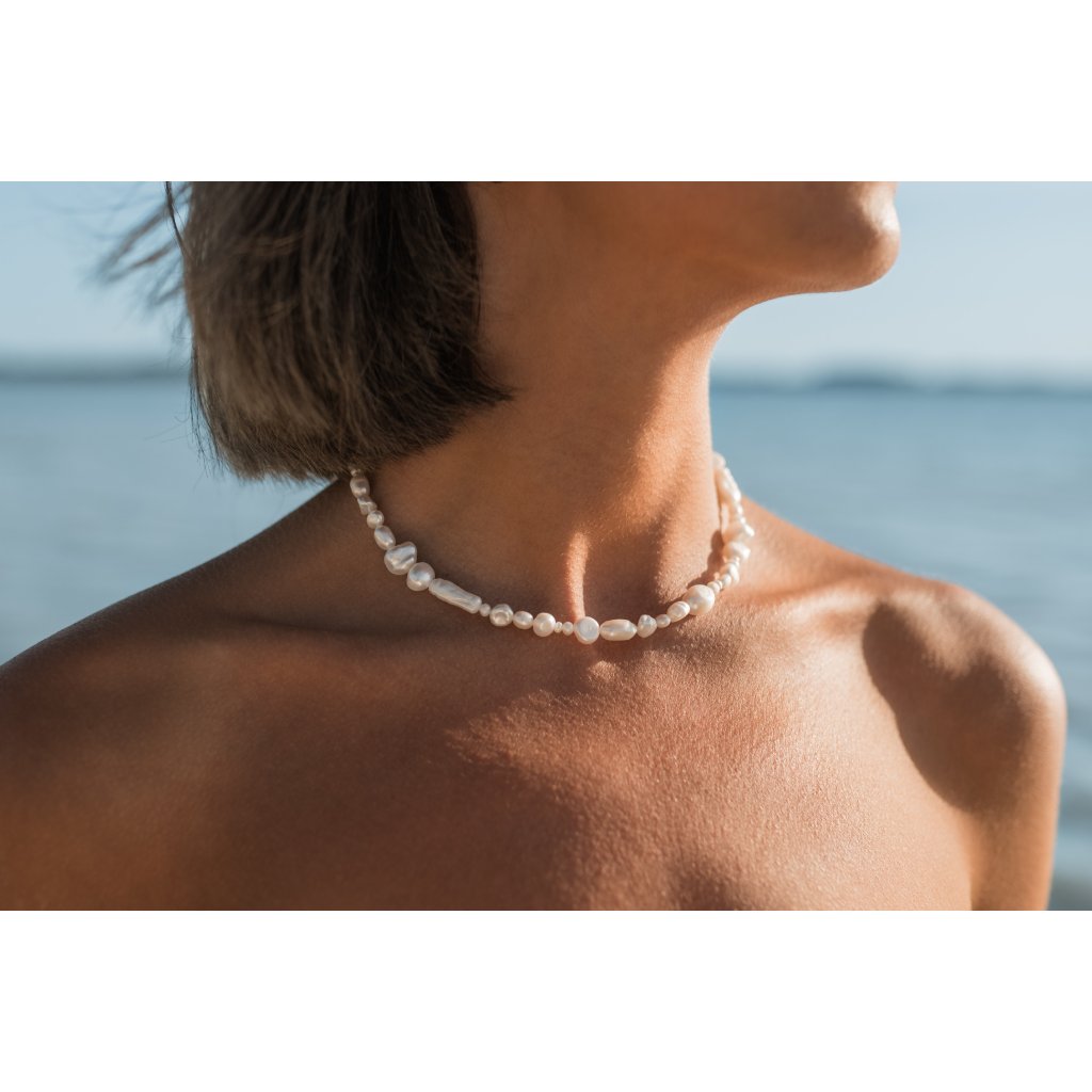 Netradiční náhrdelník z perel různých velikostí a tvarů.