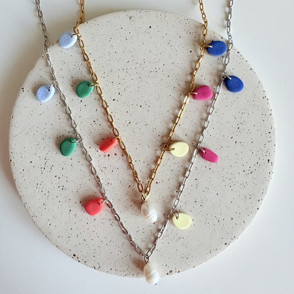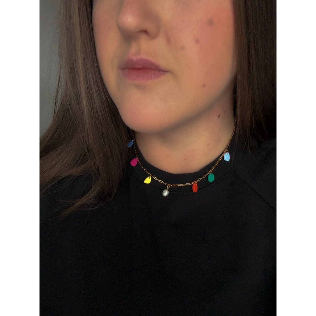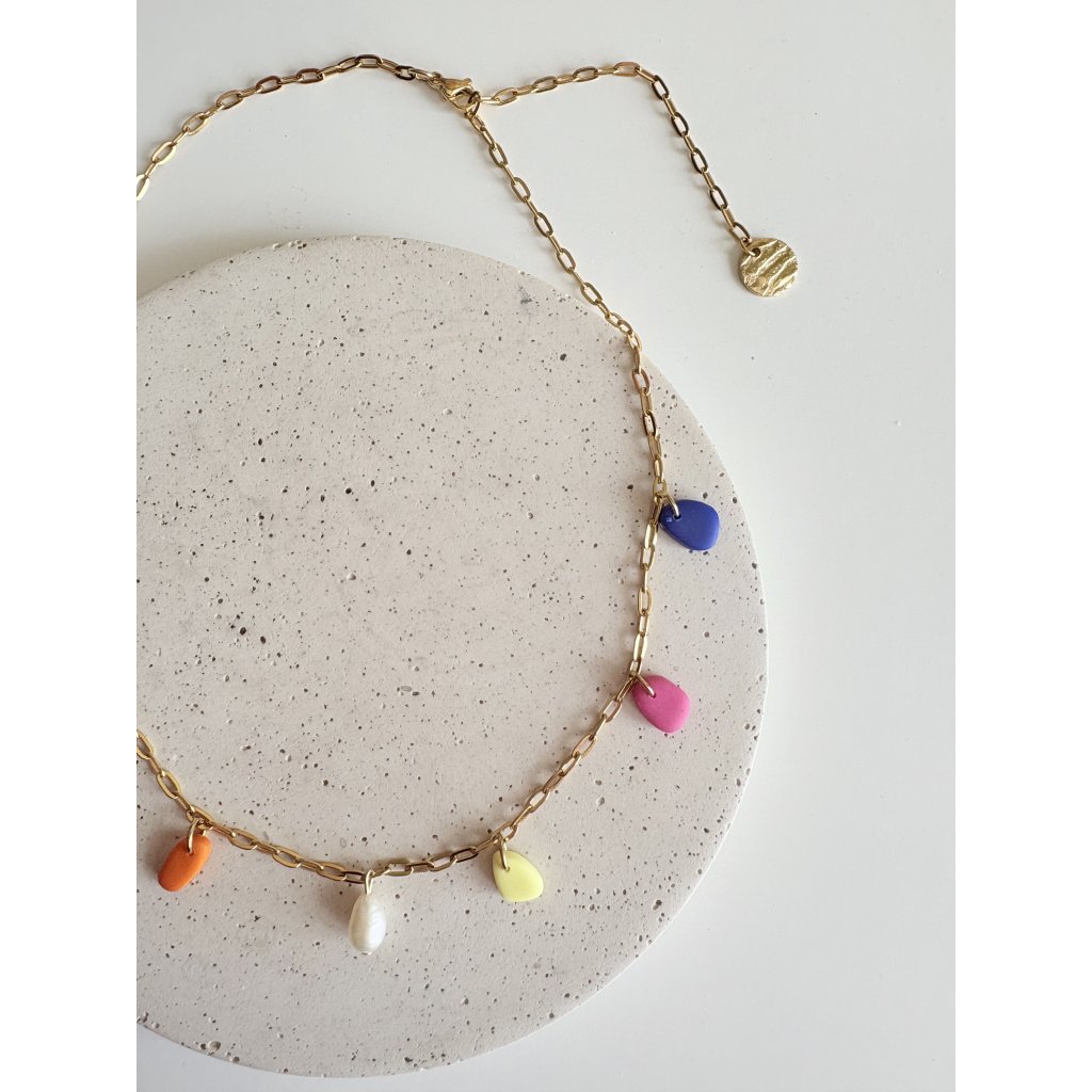 Náhrdelník z chirurgické oceli s říční perlou a barevnými kamínky.