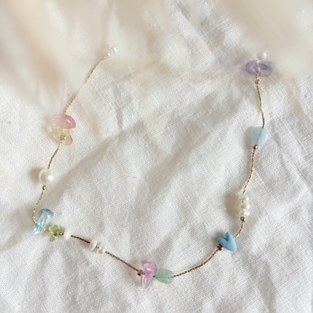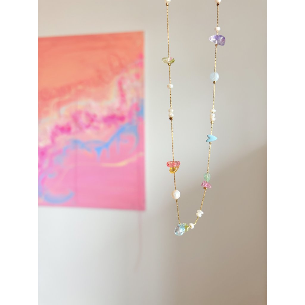 Jemný řetízek o tloušťce pouhých 0,5 mm, který působí téměř neviditelně – jako by se na krku vznášel. Zdobí ho sladkovodní perly, barevné skleněné kamínky a hravý detail ve tvaru srdíčka. Kombinace něžnosti a barev dodává šperku lehkost i originalitu.