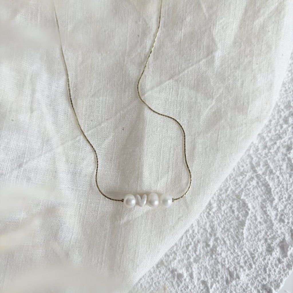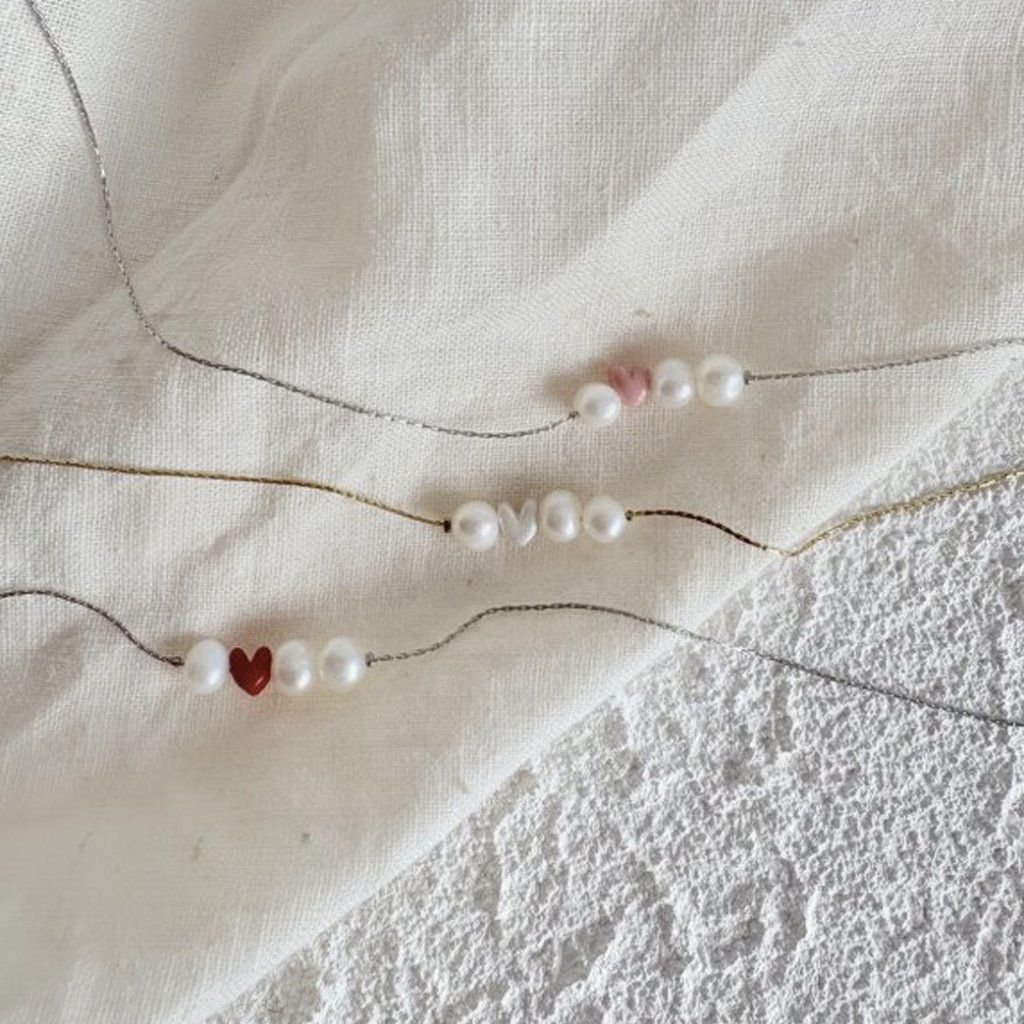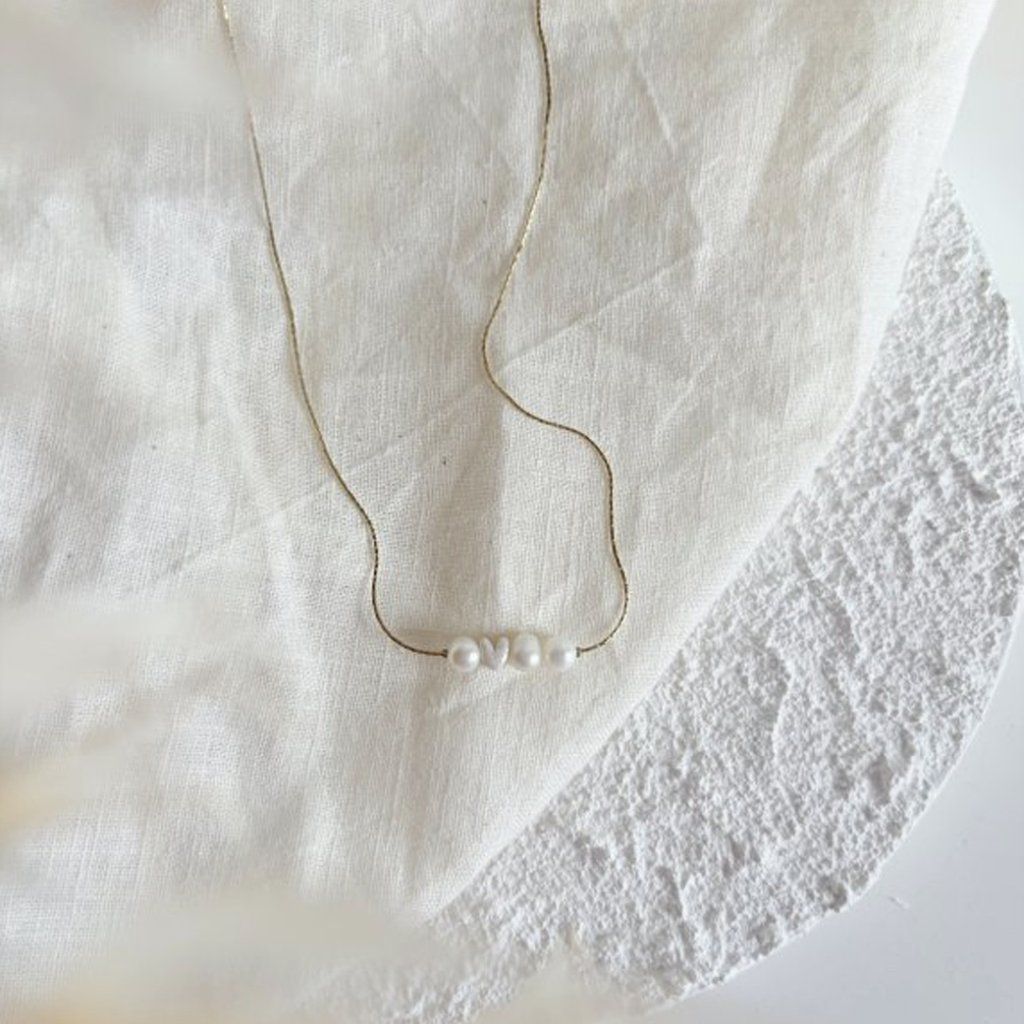 Řetízek o síle 0,5 mm nese tři drobné perly a srdíčko uprostřed — symbol lásky, klidu a ženskosti.