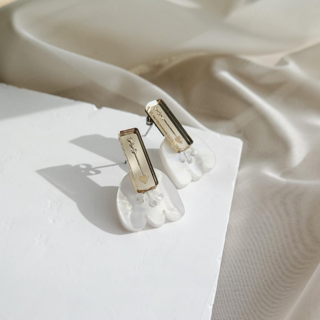 Každou náušnici krásně zdobí laserem vyřezávaný bílý či fialový tulipánový vzor z mramorovaného akrylového skla pro texturovaný a zářivý efekt. Třpytivý zlatý zrcadlový detail – s vygravírovanou jemnou šipkou ve tvaru srdce – dodává náušnici nádech romantiky a sofistikovanosti. Náušnice jsou pečlivě vyrobeny a mají hypoalergenní puzetky z nerezavějící oceli, které zajišťují pohodlí a odolnost při každodenním nošení. S rozměry pouhých 18 x 28 mm jsou lehké a snadno se nosí, díky čemuž jsou ideální na dlouhé dny nebo živé večery.