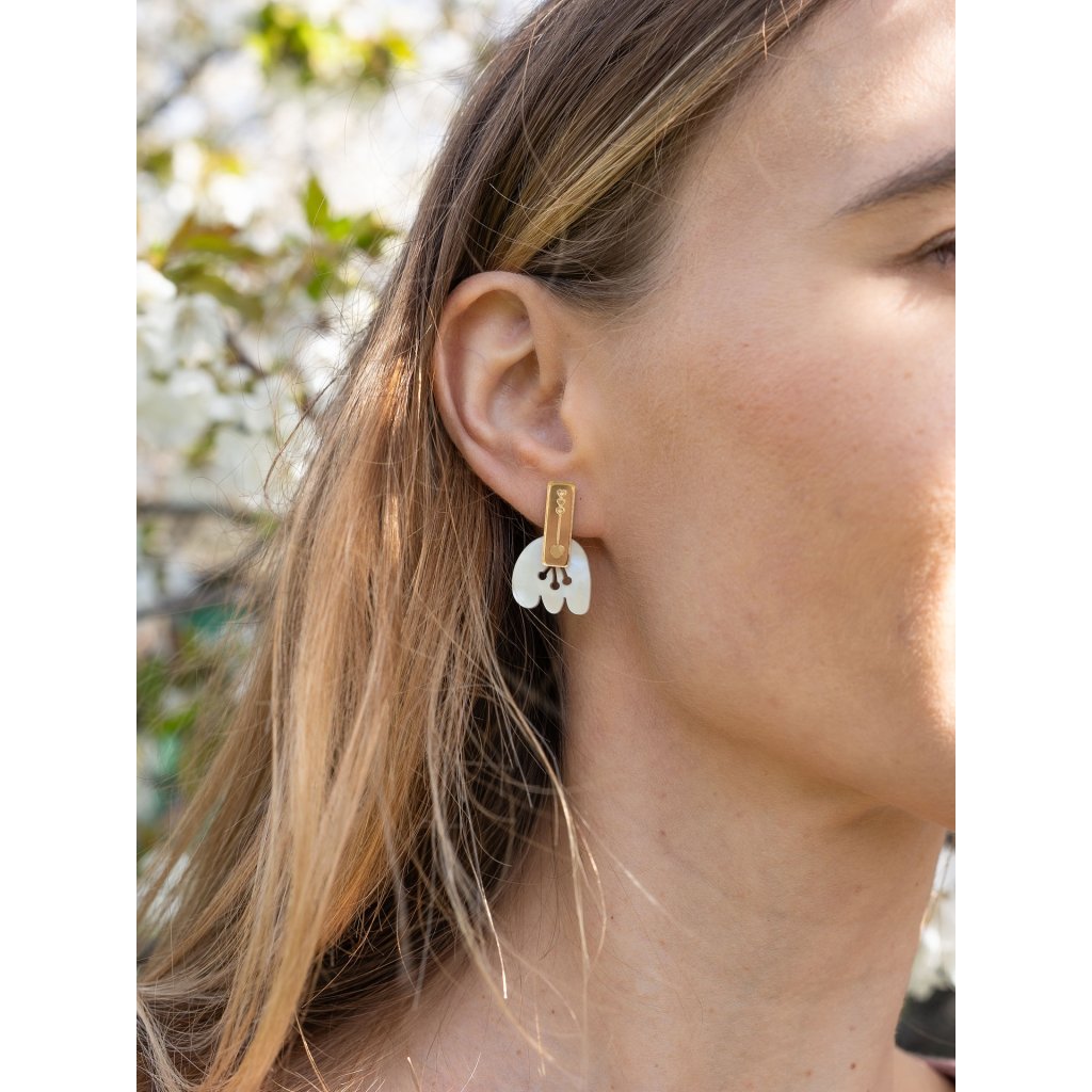 Bohaté mramorované bílé/fialové akrylové a reflexní zlaté detaily vytváří neodolatelnou směs hravosti a sofistikovanosti. Ať už je kombinujete s elegantními koktejlovými šaty nebo pozvednete ležérní brunch look, romantické tulipánové náušnice dodají každému outfitu rozmarný a moderní nádech. Jsou tématem pro rozhovor, nádechem jara a dokonalým doplňkem každého outfitu.