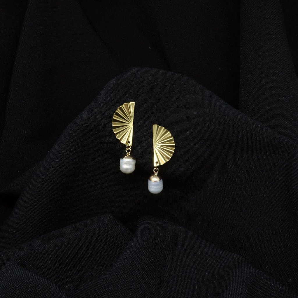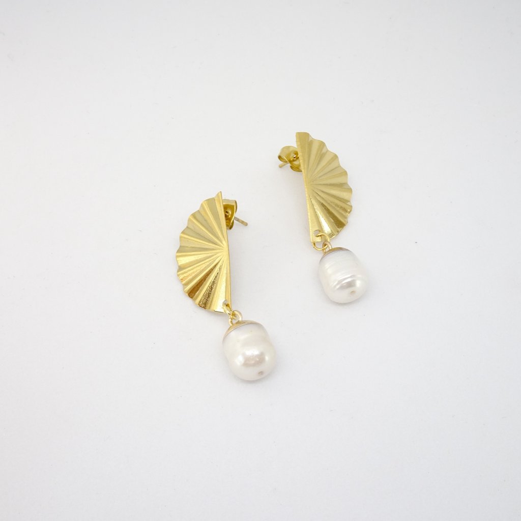 Elegantní náušnice z pozlacené nerez oceli a s přívěskem říční perly ve tvaru kapky.