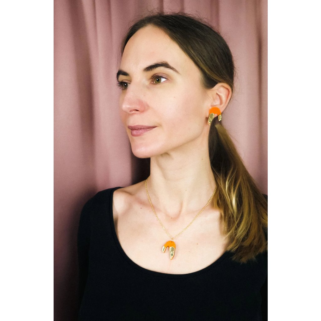 Neonová oranžová v kombinaci se zlatou a smaragdovýma očima. Z dálky se tváří jako obyčejné náušnice, ale při bližším pohledu každého pobaví.