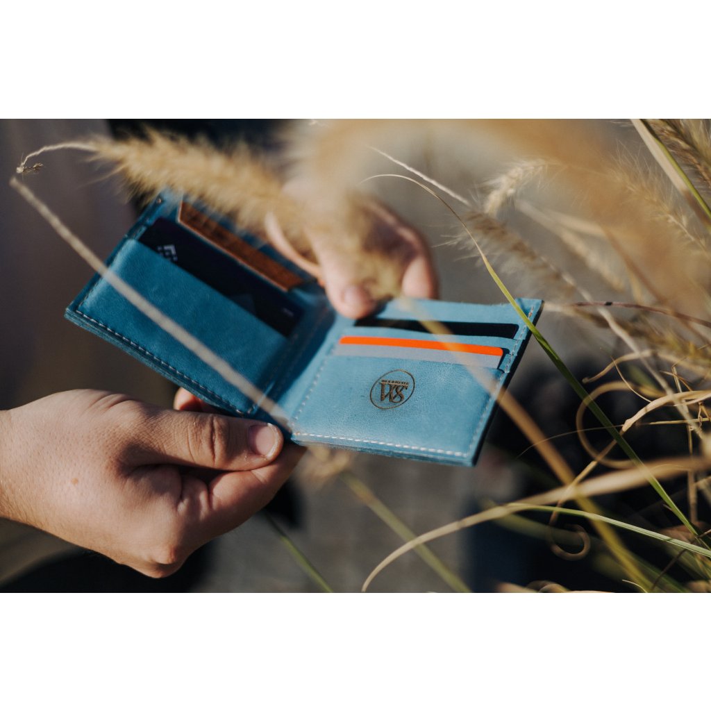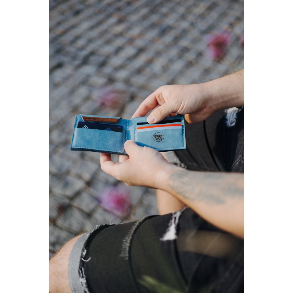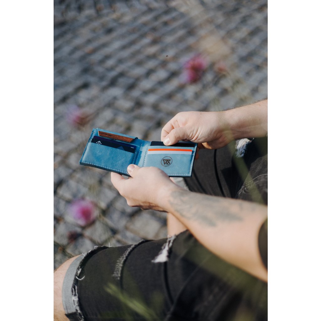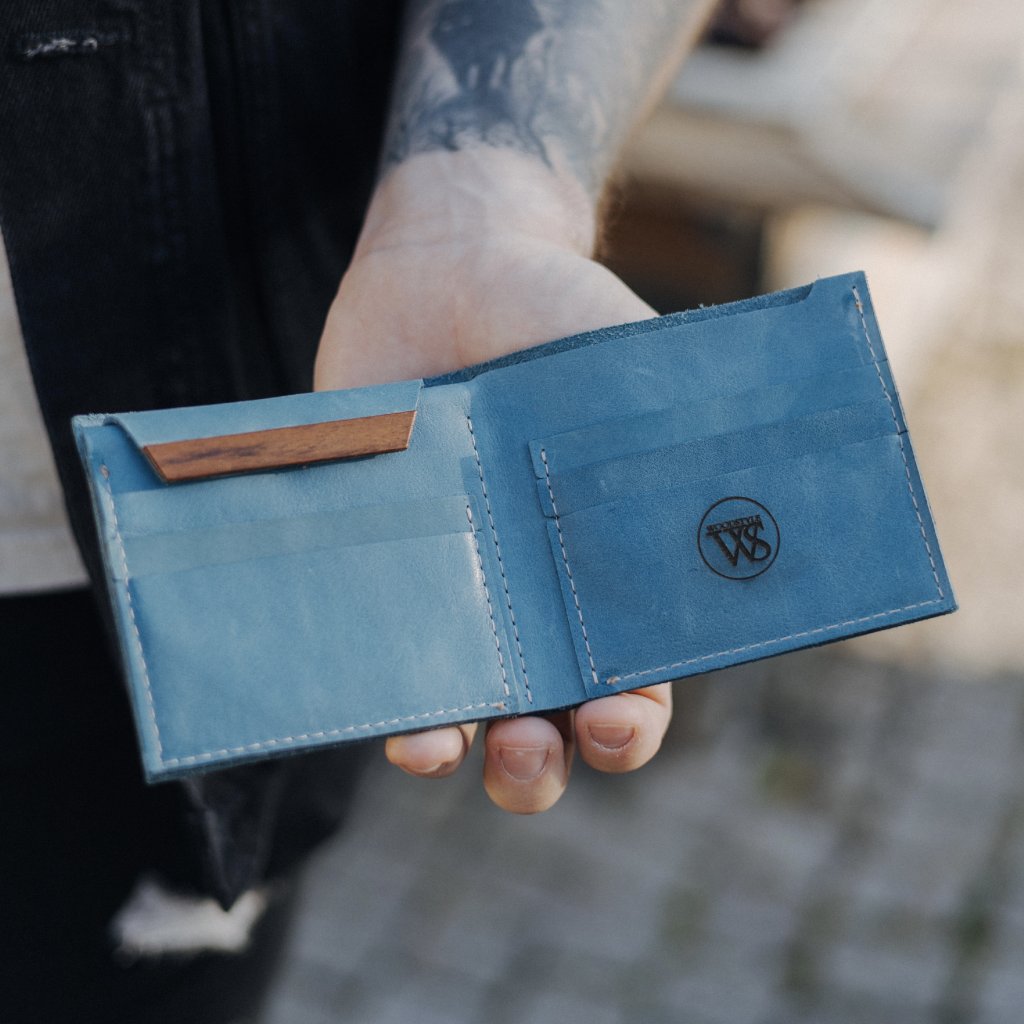 Pánská kožená peněženka s dřevěným detailem na mince i bankovky.