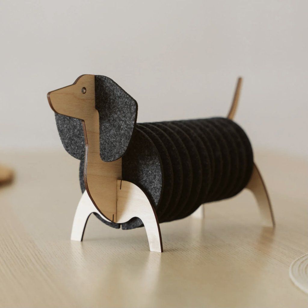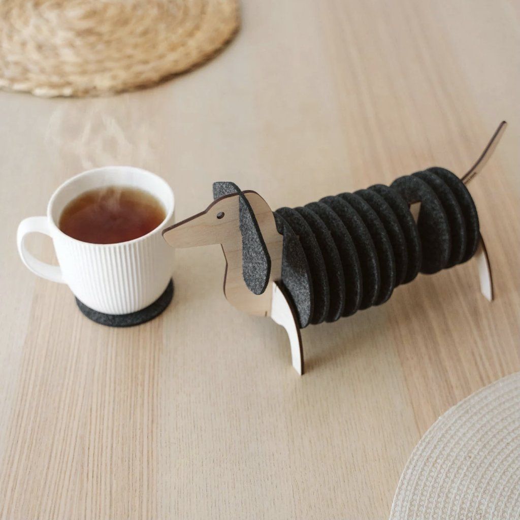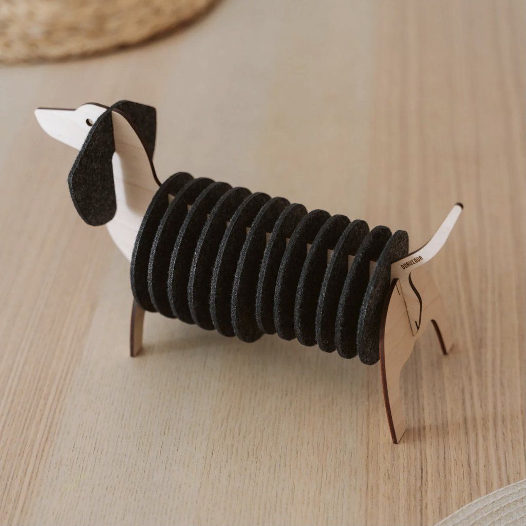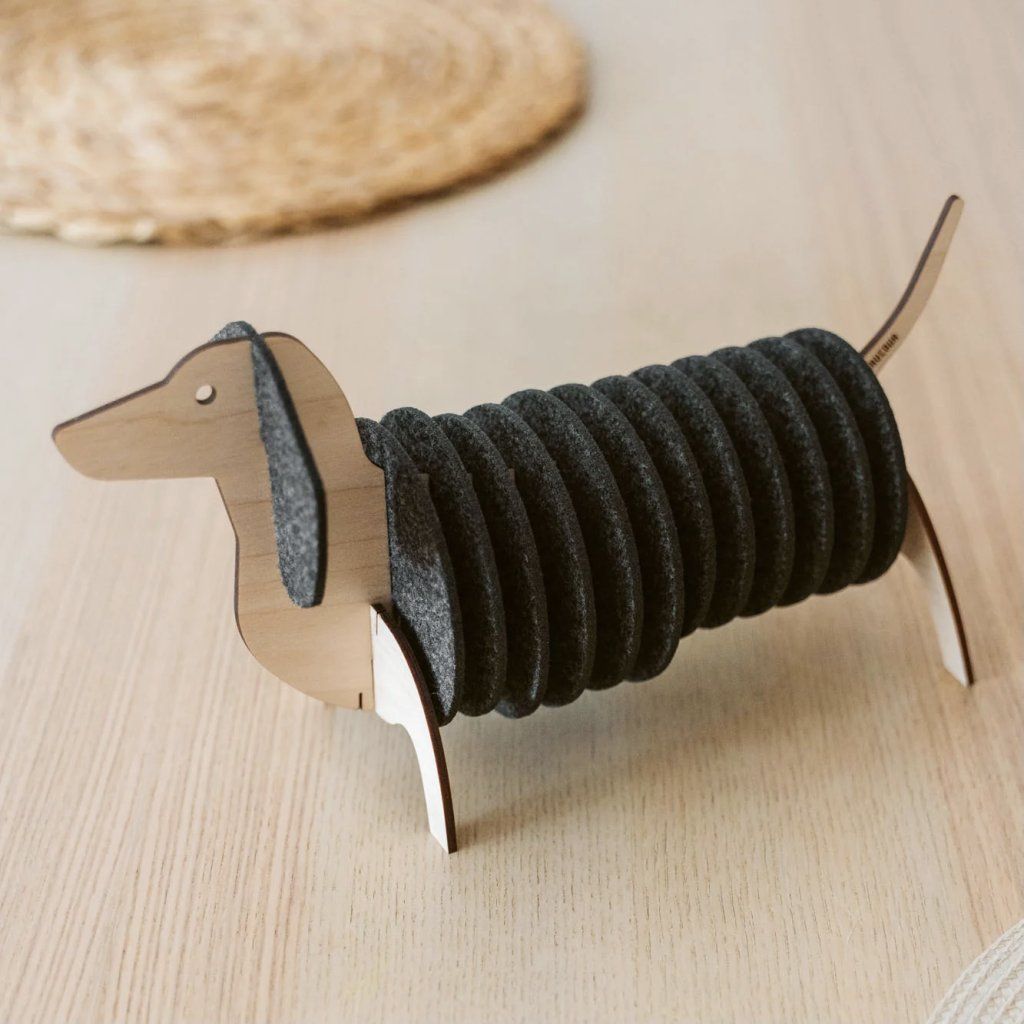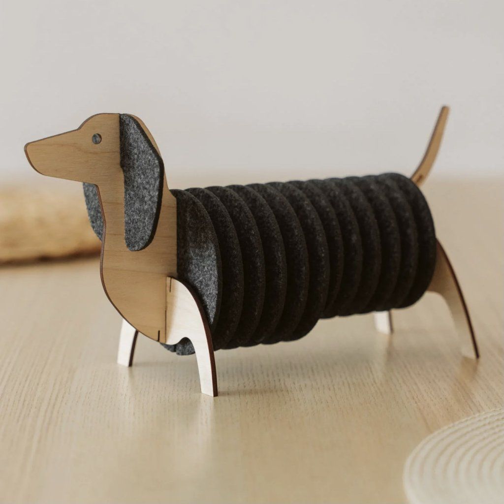 Tento kousek je navržen tak, aby byl stejně odolný i roztomilý. Tělo jezevčíku je vyřezáno laserem z prvotřídní březové překližky, což zajišťuje přesnou a pevnou konstrukci. Podložky jsou vyrobeny z hustého PET filcu vyrobeného v EU, který odolá každodennímu používání. Celá sada se dodává v kompaktní krabičce a sestavíte ji za pár minut jako zábavné 3D puzzle, takže její skládání je radost.