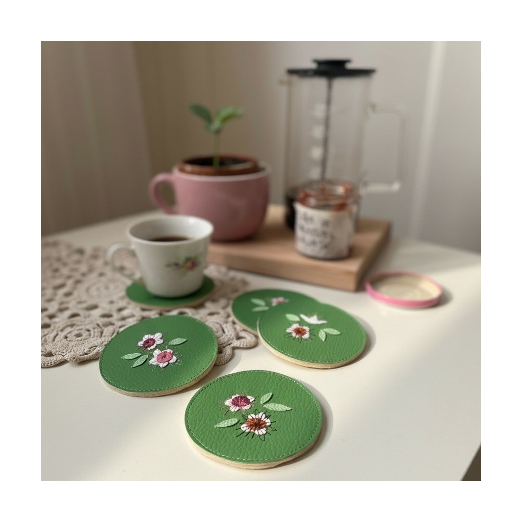 Pro podtácky používám kolečka zbylá po šití jiných designových kousků, minimalizuji tak množství materiálu, který by jinak už nebyl k užitku. Ručně vystřihávaná kvítka, vyšití každého jednoho z nich, a pak také ručně ostřihaná kolečka podtácků. Takhle vypadá 100% handmade.
