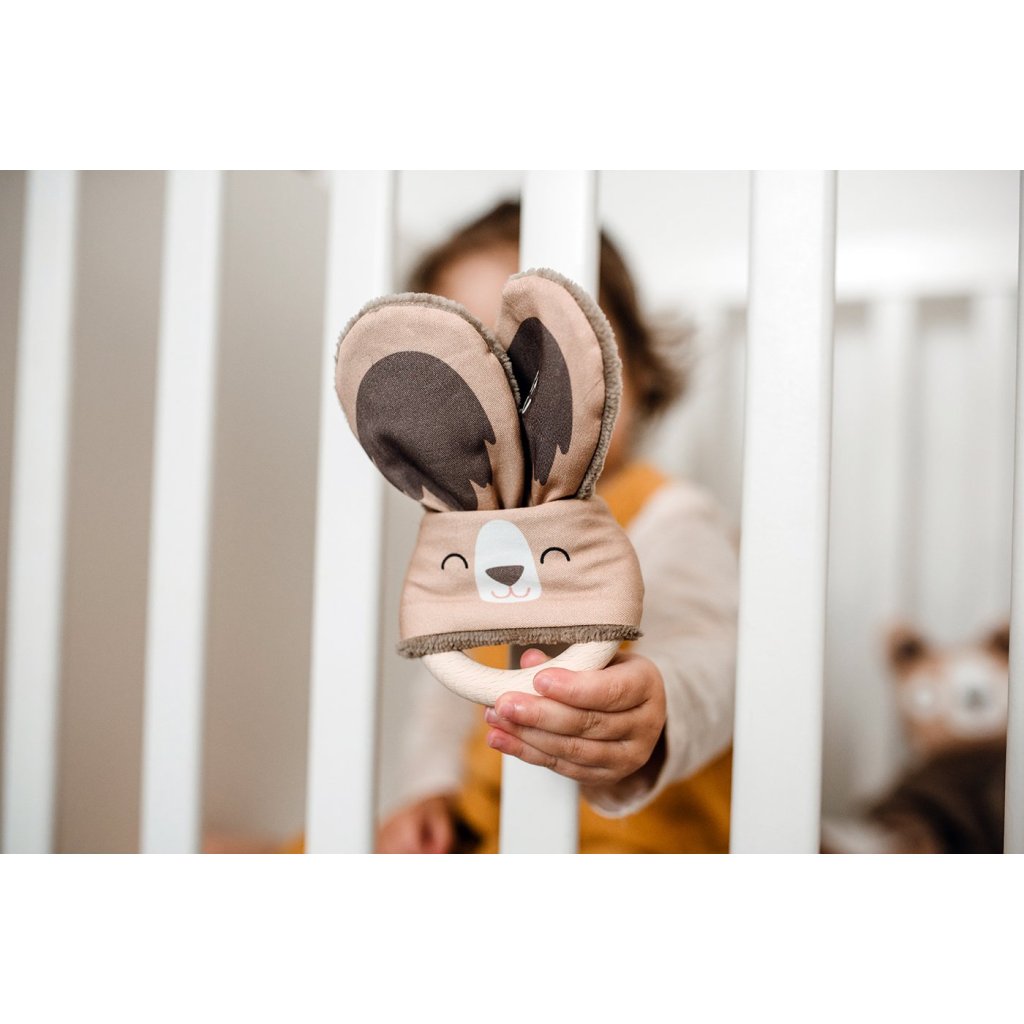 Jsem šustivý kamarád pro miminko (0 - 2 roky), které trápí zuby. Dásně svědí, bolí a miminko slintá a zkouší kousat vše včetně své ručičky. Dejte mu do ní tohohle ušatce a máte vystaráno. Dřevěný kroužek uleví od bolesti dásní při prořezávání zoubků. Dřevo působí antibakteriálně a je mnohem vhodnější než plasty. Různé materiály odvádí pozornost od bolesti.