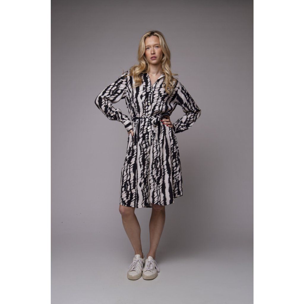 Tyto košilové šaty vycházejí z vašeho oblíbeného střihu, tentokrát však v nové výrazné variantě z lehké viskózy s černobílým abstraktním vzor. Volný oversized střih, délka ke kolenům a elegantní košilové detaily zůstávají stejné – originální vzor ale dodává šatům zcela nový charakter.