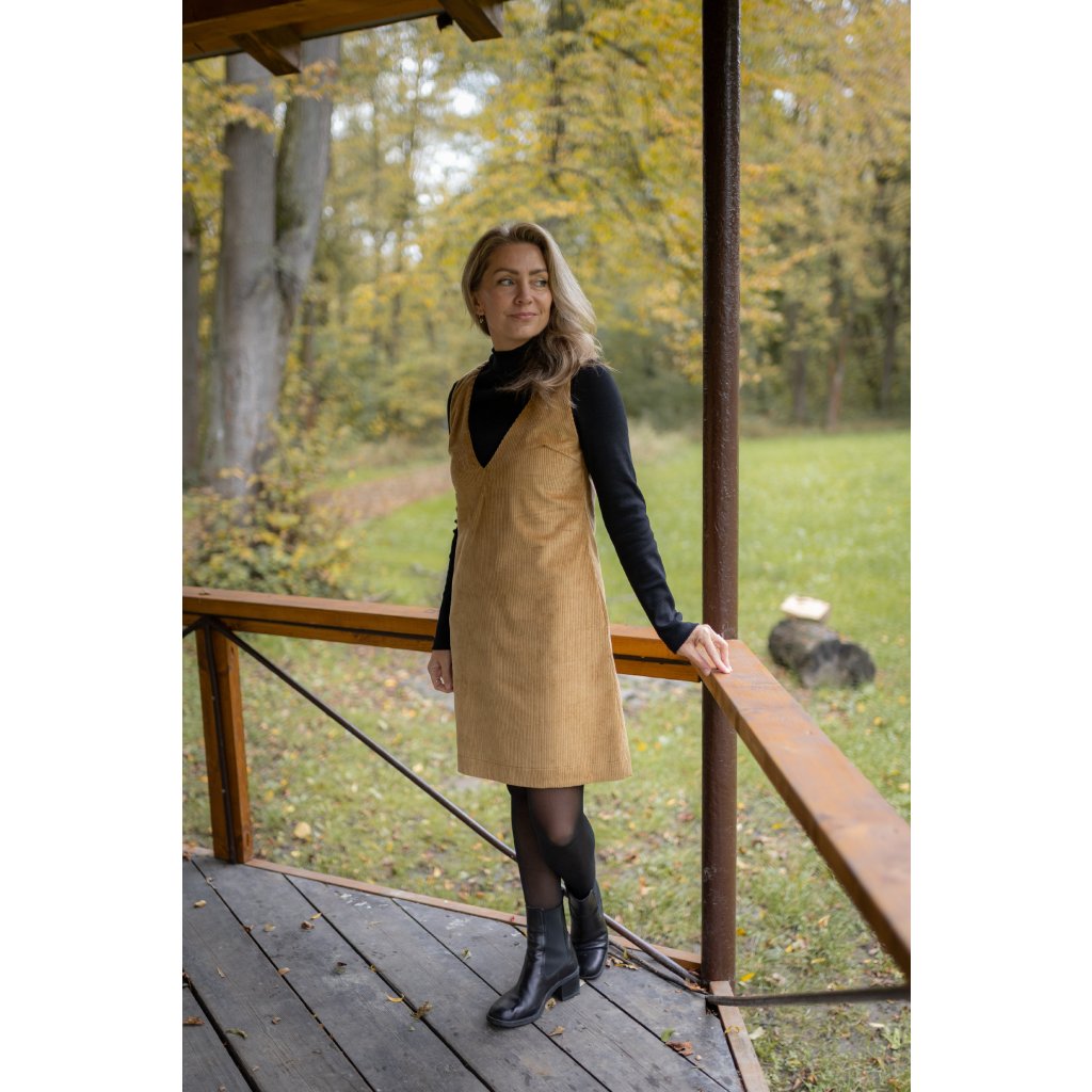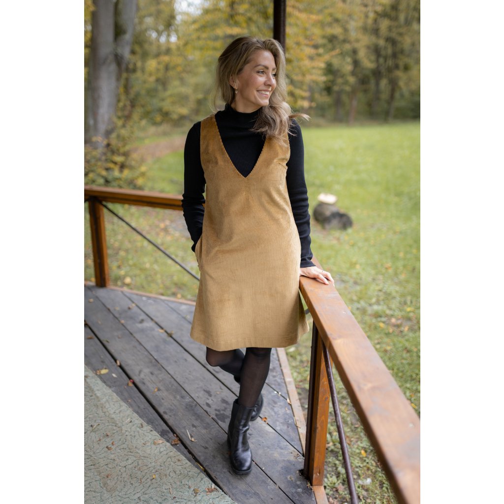 Greta je šatovka, která v sobě spojuje eleganci, pohodlí a nenucenou ženskost. Je ušitá z pevnějšího, hřejivého manšestru s jemným leskem, který krásně drží tvar a přizpůsobí se postavě. Horní část má pouzdrový střih, dolní se lehce rozšiřuje do Áčka, což vytváří přirozeně lichotivou siluetu a zajišťuje pohodlí při chůzi.