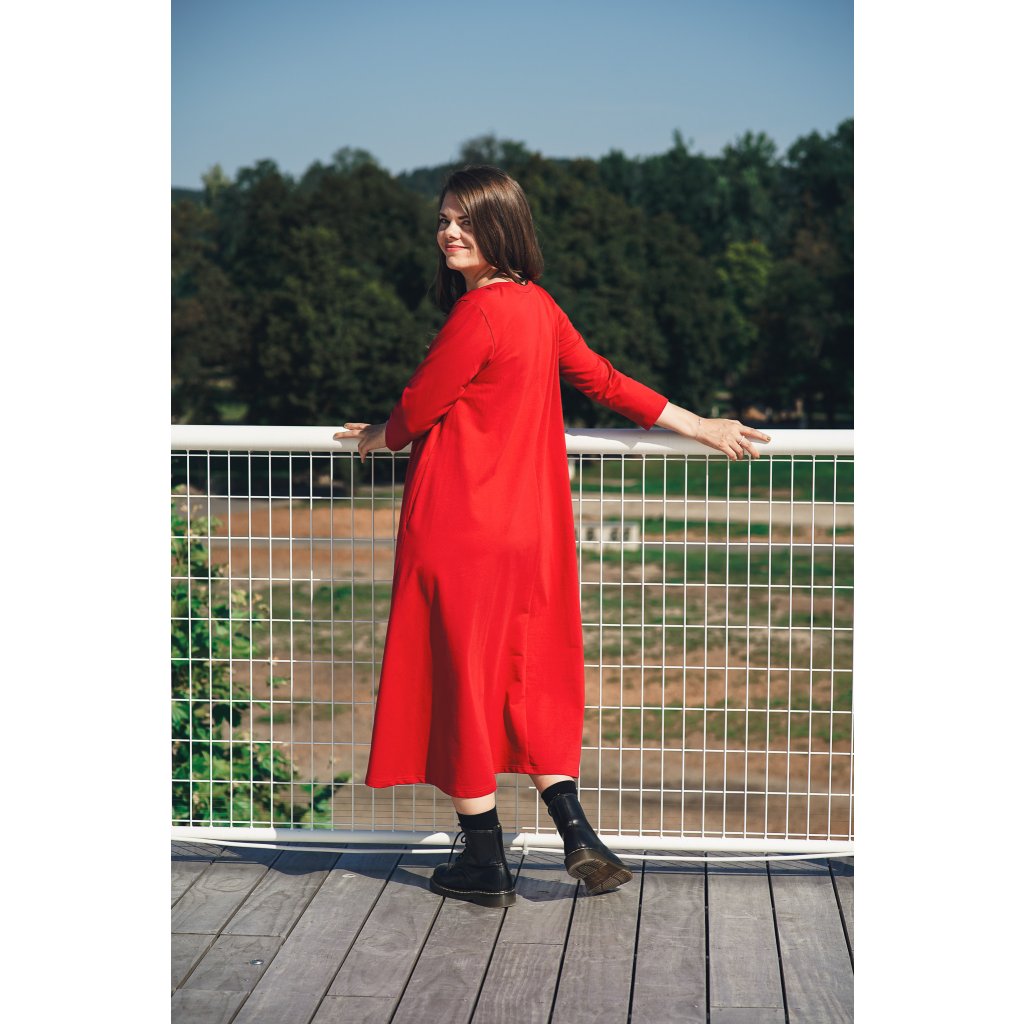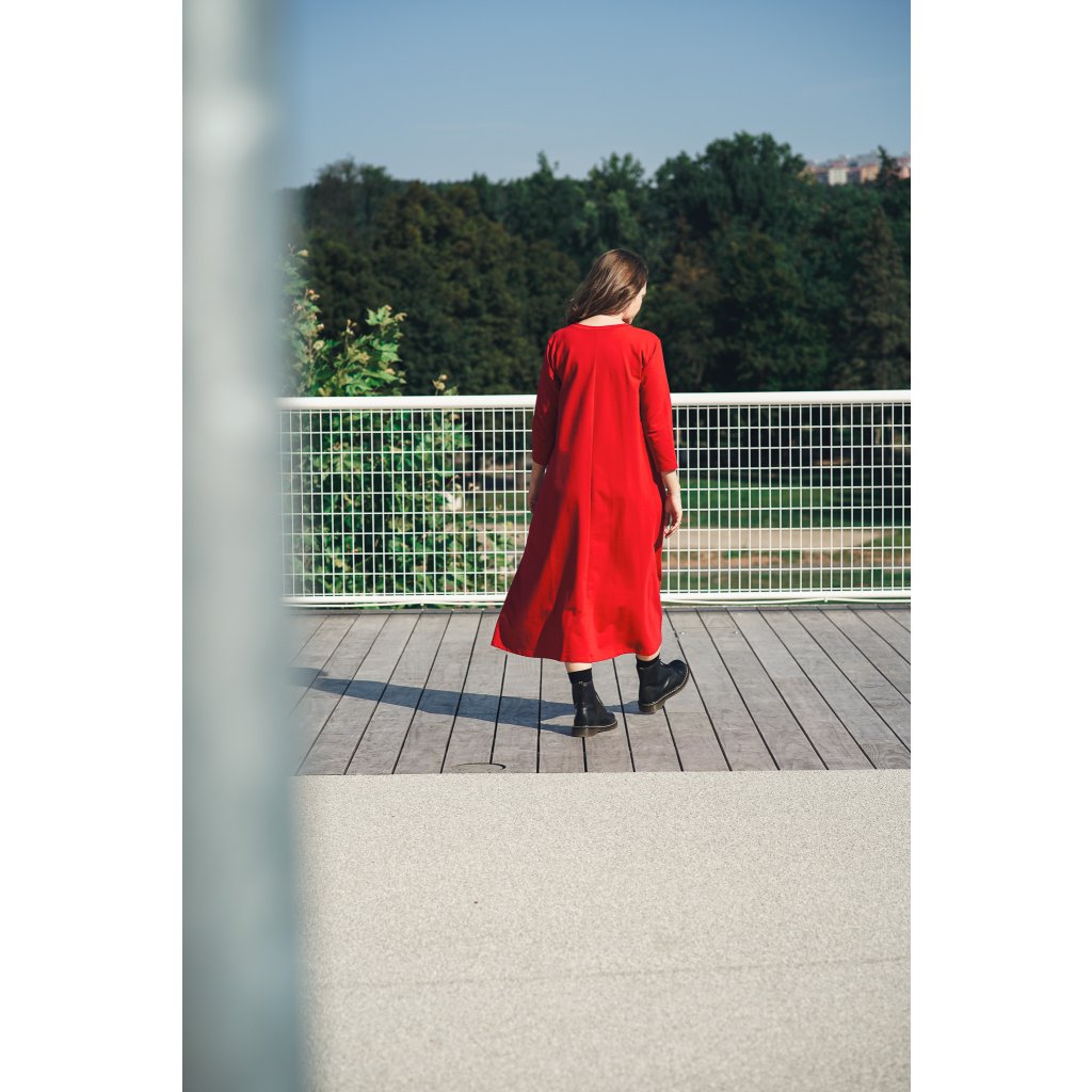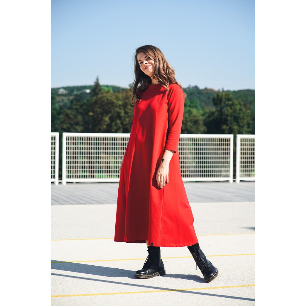 Šaty Season Red jsou minimalistické šaty áčkového střihu s 3/4 rukávem, ušité z velmi příjemné a hřejivé bavlněné teplákoviny a jsou ideální pro chladnější dny. Šaty můžete nosit jen tak nebo se silonkami a nebo je doplnit koženým páskem, je to jen na Vás. Jsou velmi pohodlné, sluší mnoha typům postav a nechybí jim ani praktické kapsy. Šaty unosíte od podzimu do jara a krásně se do nich vejde i těhotenské bříško.