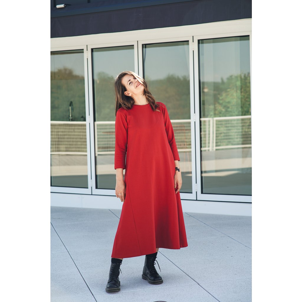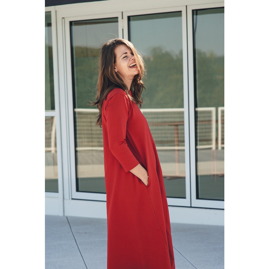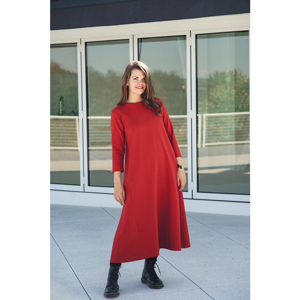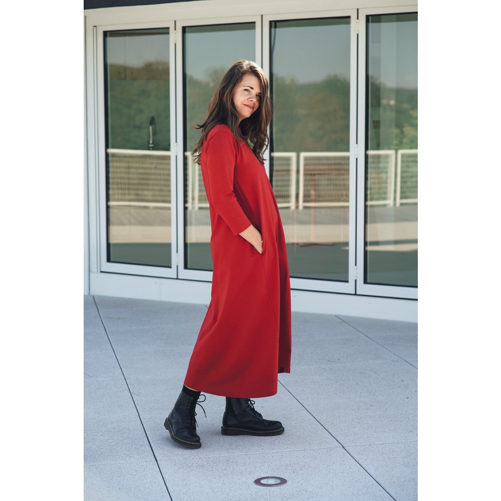 Šaty Season Red jsou minimalistické šaty áčkového střihu s 3/4 rukávem, ušité z velmi příjemné a hřejivé bavlněné teplákoviny a jsou ideální pro chladnější dny. Šaty můžete nosit jen tak nebo se silonkami a nebo je doplnit koženým páskem, je to jen na Vás. Jsou velmi pohodlné, sluší mnoha typům postav a nechybí jim ani praktické kapsy. Šaty unosíte od podzimu do jara a krásně se do nich vejde i těhotenské bříško.