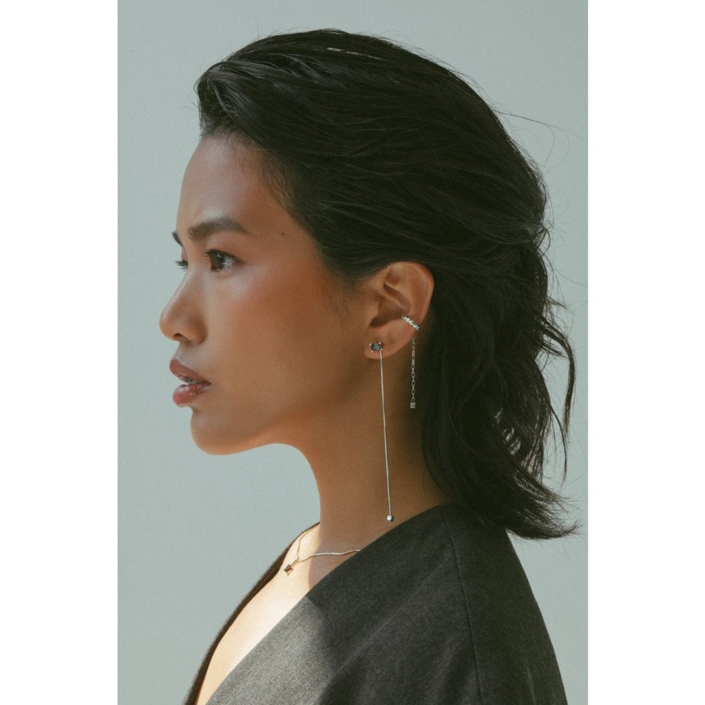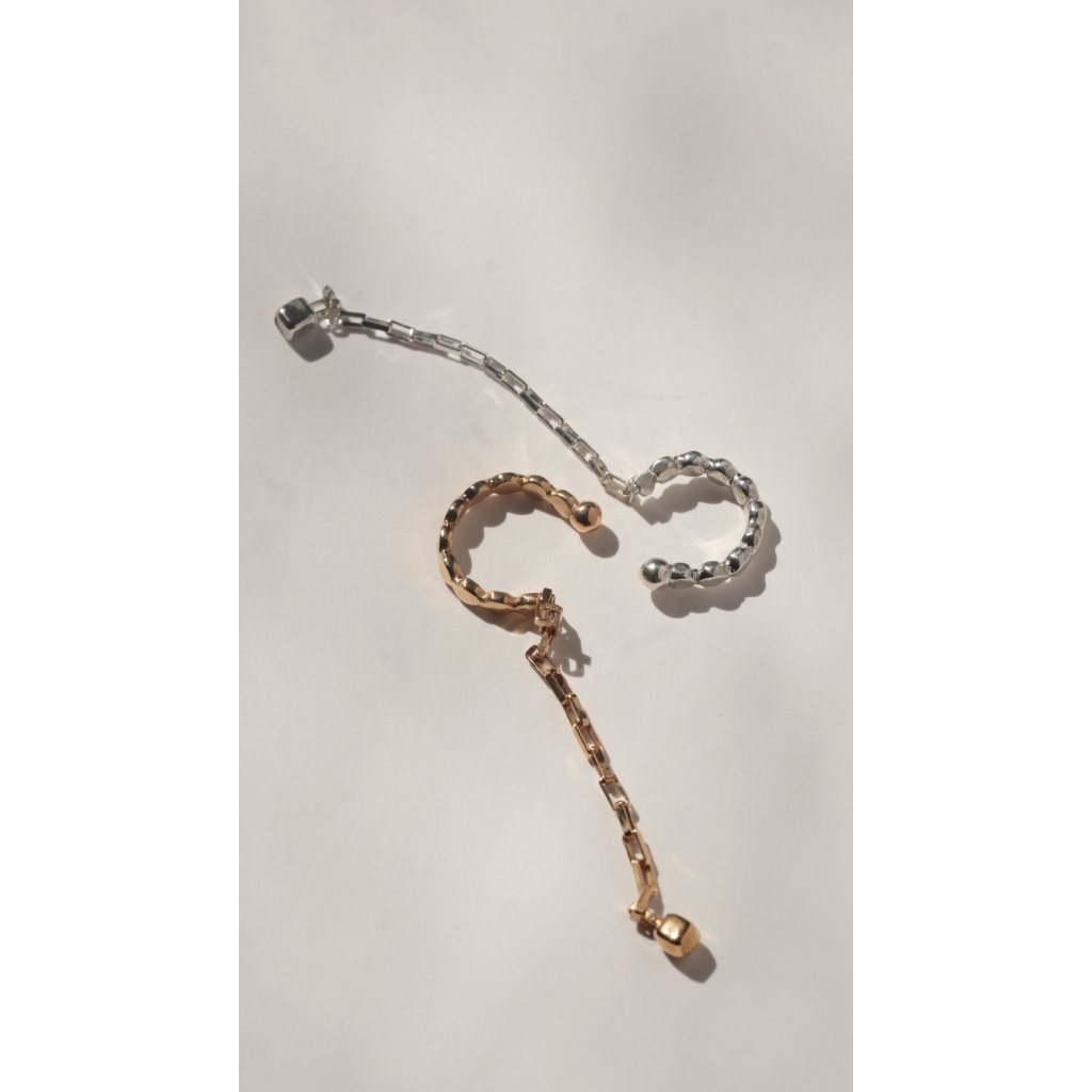 Kouzlo tomuto šperku propůjčuje souhra několika motivů – na jedné straně jsou to drobné, plné elipsy seskládané do elegantního proužku, který obtéká ucho, na straně druhé geometricky výrazné hrany oček volně visícího řetízku.