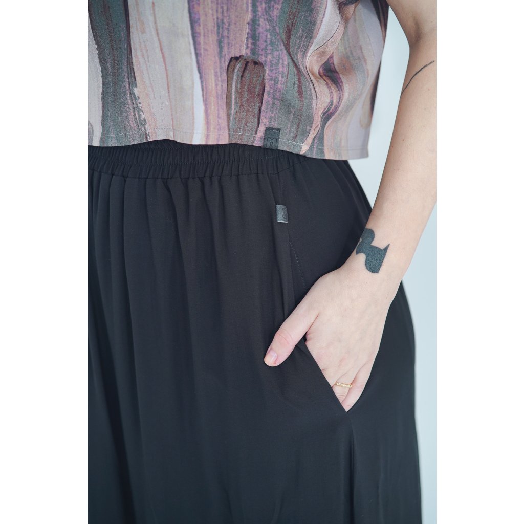 Dlouhá sukně s kapsami a rozparkem, která je ušitá z opravdu velmi příjemné LENZING™ ECOVERO™ viskózy. Sukně je lehoučká, splývavá a v pase má pružnou gumu, která se přizpůsobí. Univerzální kousek, který padne každé postavě.