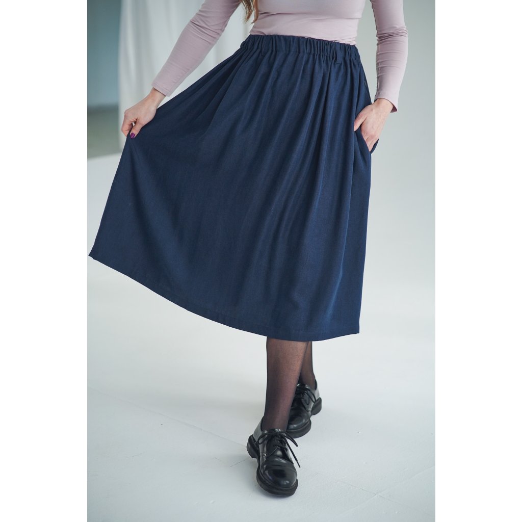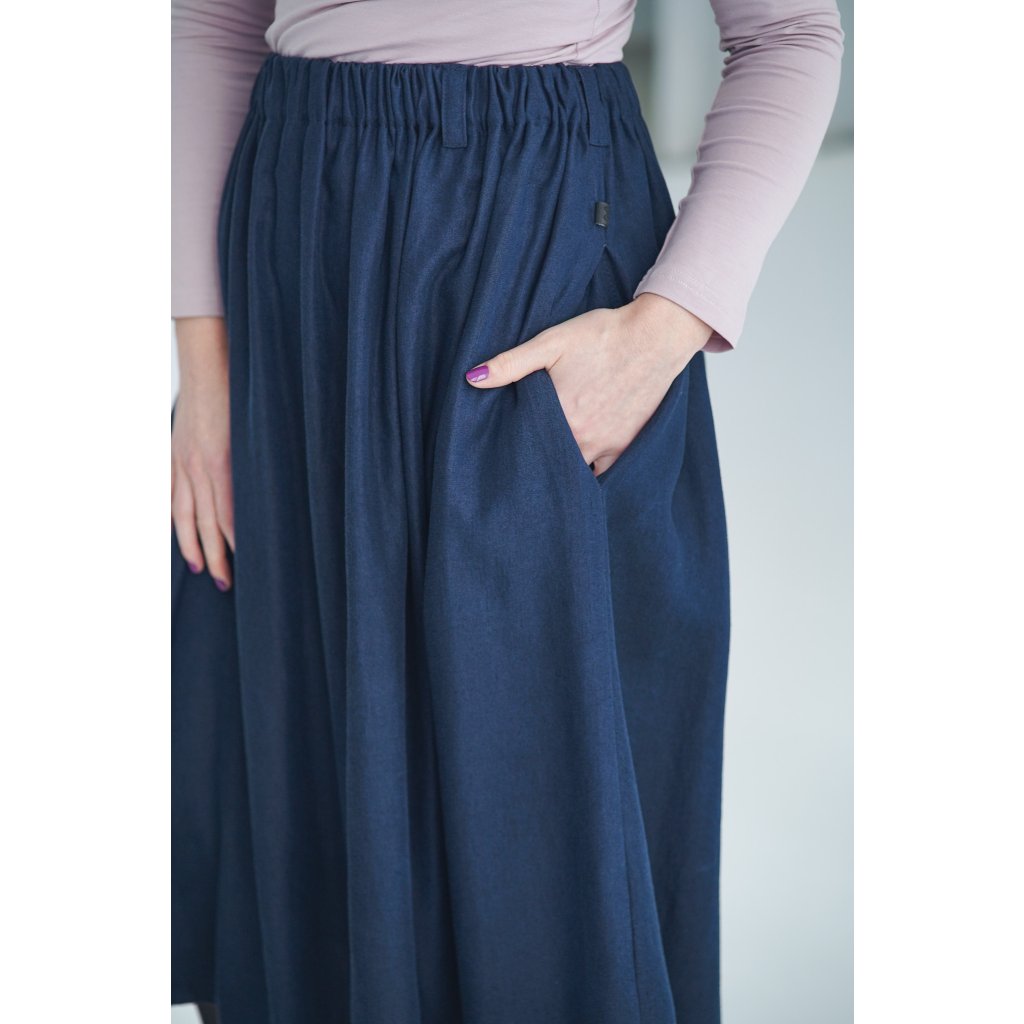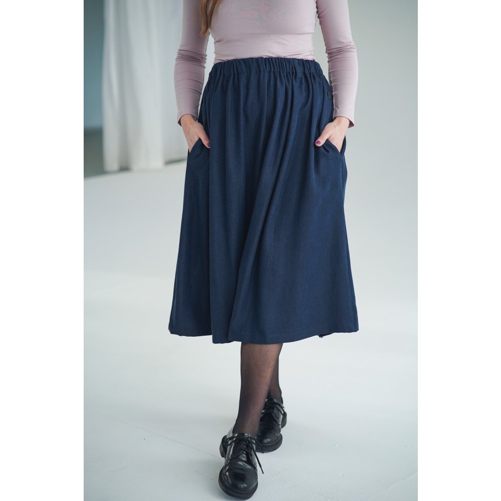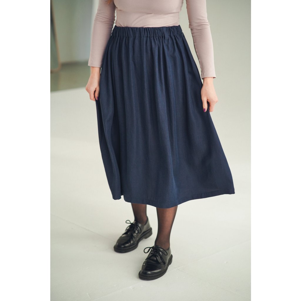 Dlouhá a široká sukně s kapsami a nově také s poutky na pásek, která je ušitá z elegantního a udržitelného tencelu. Univerzální kousek, který padne každé postavě. Tento model je vhodný i pro postavy s širšími boky. Sukně je lehoučká, splývavá a velmi slušivá a v pase má pružnou gumu, která se přizpůsobí a díky poutkám ji můžete doplnit páskem (viz. třetí fotografie).