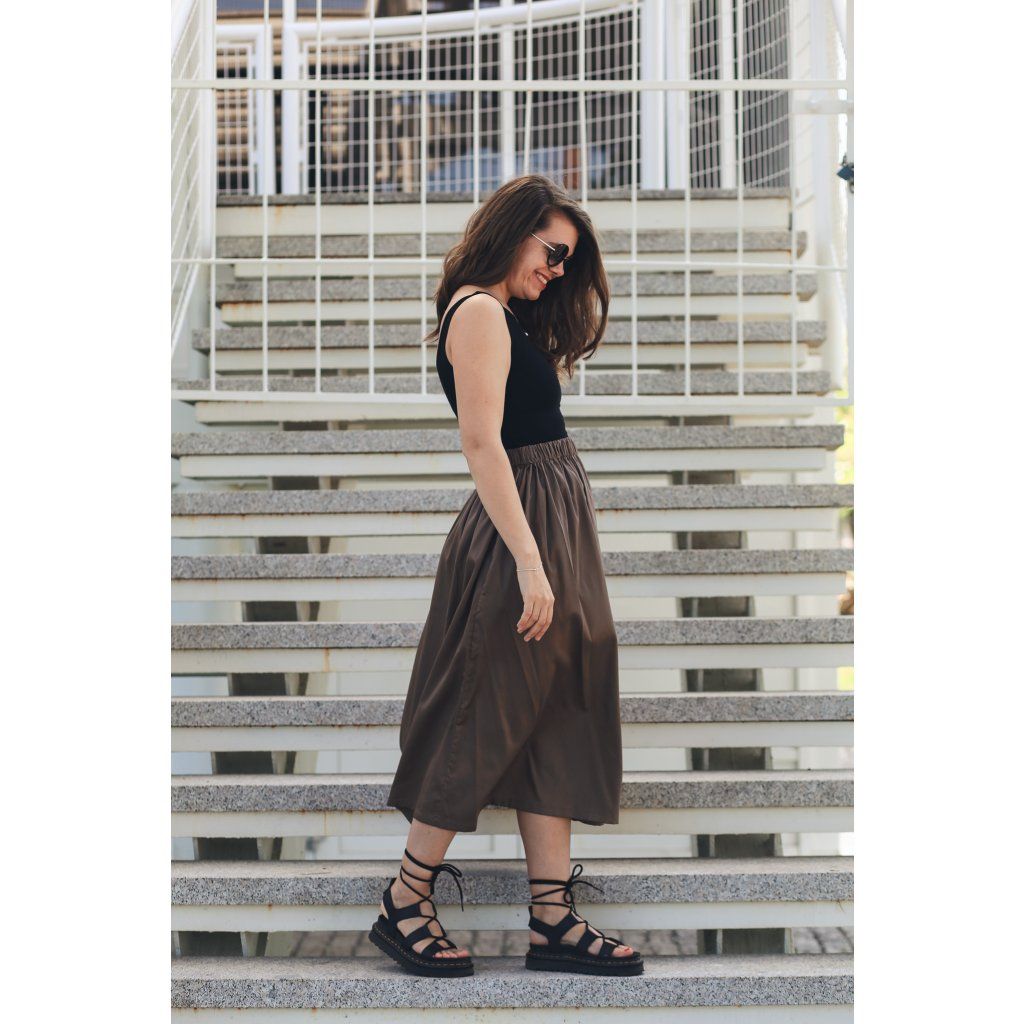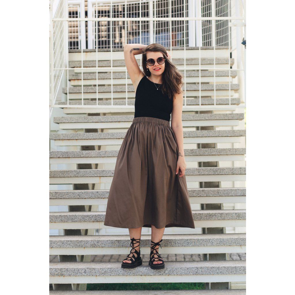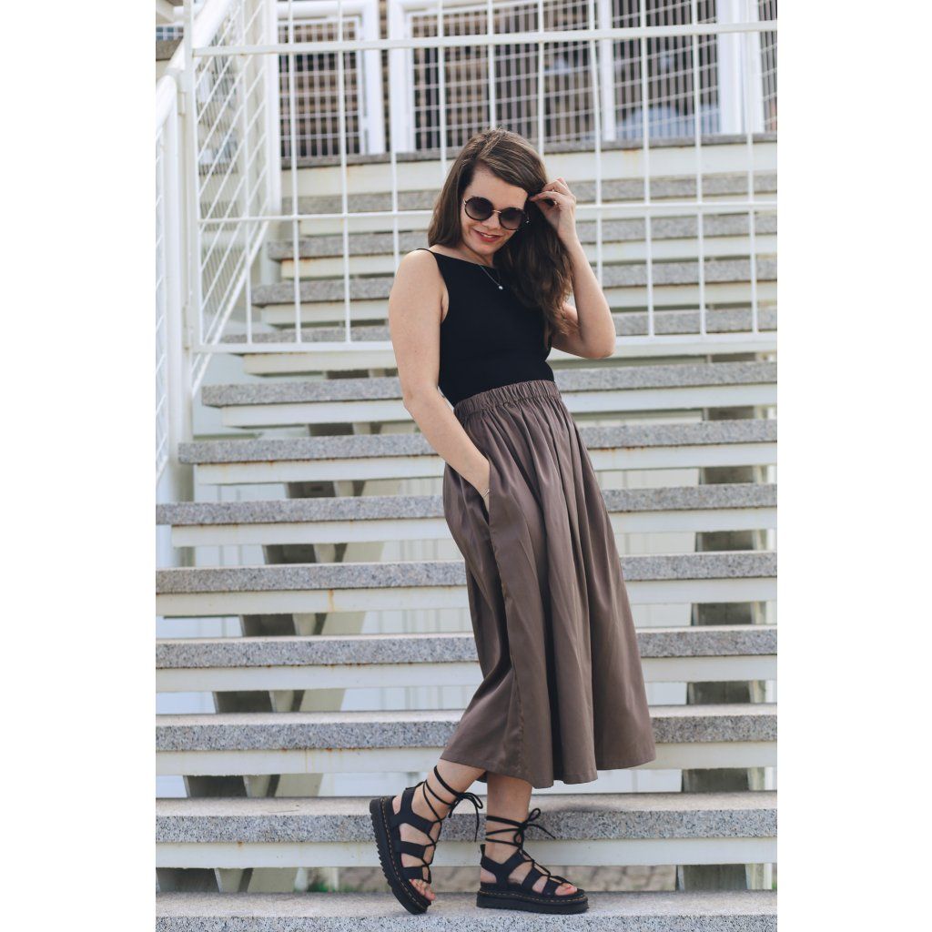 Dlouhá a široká sukně s kapsami a nově také s poutky, která je ušitá z elegantní a lehoučké saténové bavlny. Univerzální kousek, který padne každé postavě. Sukně je lehoučká, splývavá a velmi slušivá a v pase má pružnou gumu, která se přizpůsobí a poutka.