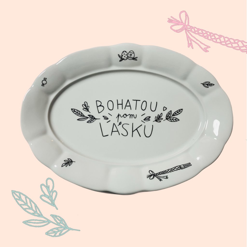 Velikonoce s úsměvem. Porcelánový tác s nápisem „Bohatou pom lásku“ si pohrává s tradiční pomlázkou a přináší ji v něžnější, láskyplné verzi.Ideální na servírování dobrot, vajíček nebo jako stylová dekorace na velikonoční stůl.