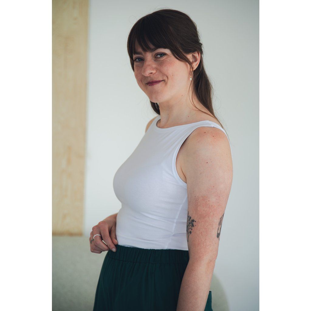 Oboustranné tílko, které můžete nosit výstřihem dopředu či dozadu. Když dáte výstřih dozadu, budete mít krásný lodičkový výstřih. Tričko vypadá elegantně, je ušito z pohodlného bavlněného úpletu, který obstojí při každé příležitosti.