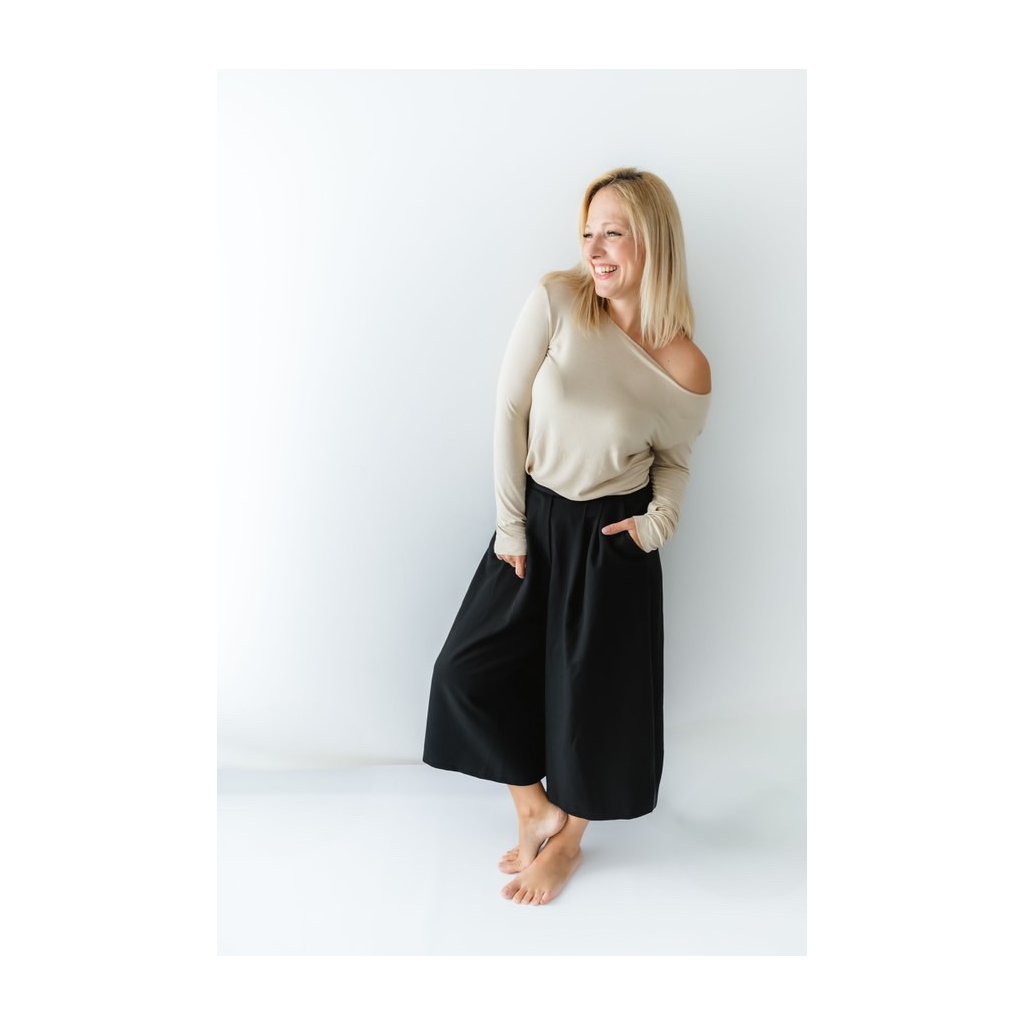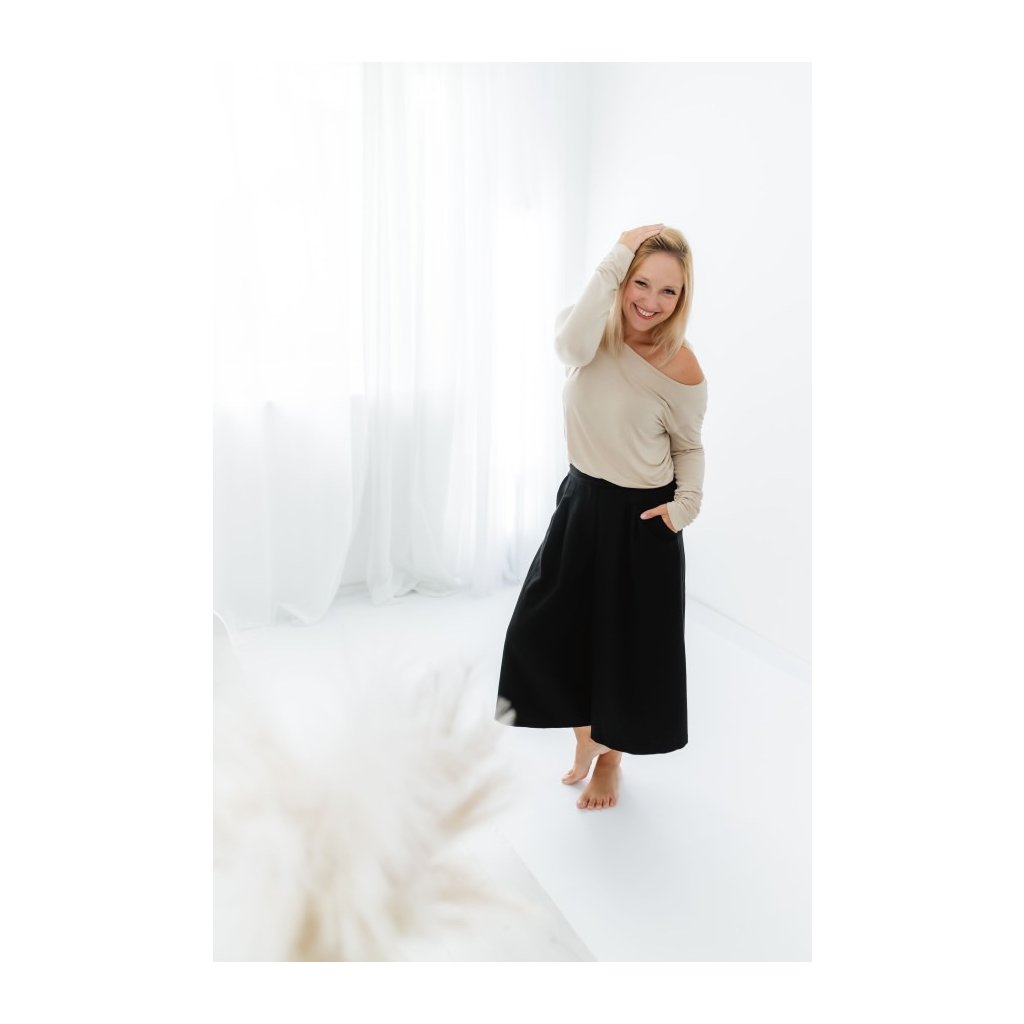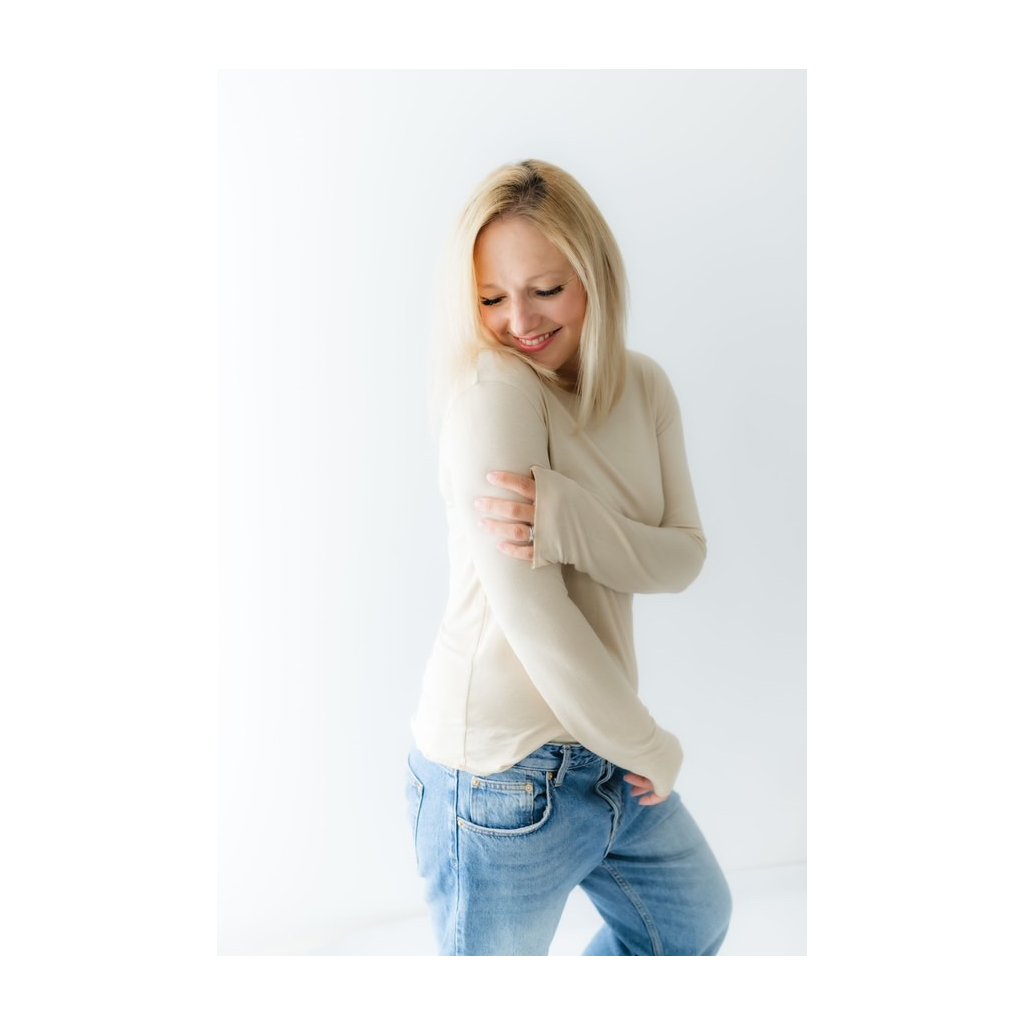 Lehounké tričko z příjemného splývavého materiálu. Má prodloužené rukávy, ideální do sychravého počasí - stačí se zachumlat! Výstřih je širší, je tedy možné ho nosit různými způsoby - ať už symetricky přes obě ramena nebo s jedním poodhaleným.