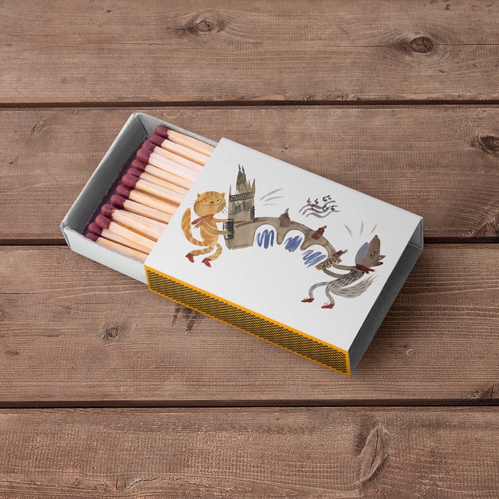 Originální krabička sirek zdobená jedinečnou ilustrací, která kombinuje hravý motiv s osobitým výtvarným stylem autorky. Vhodné jako praktický doplněk i stylový dárek s uměleckým nádechem.
