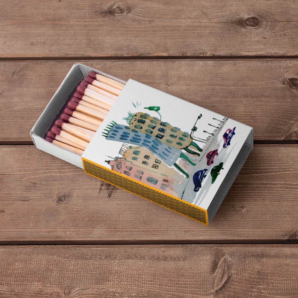 Originální krabička sirek zdobená jedinečnou ilustrací, která kombinuje hravý motiv s osobitým výtvarným stylem autorky. Vhodné jako praktický doplněk i stylový dárek s uměleckým nádechem.